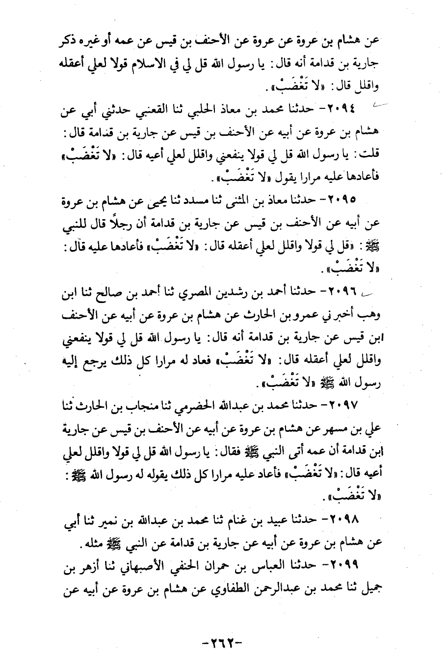 2096 - حَدَّثَنَا أَحْمَدُ بْنُ رِشْدِينَ الْمِصْرِيُّ، ثنا أَحْمَدُ بْنُ صَالِحٍ، ثنا ابْنُ وَهْبٍ، أَخْبَرَنِي عَمْرُو بْنُ الْحَارِثِ، عَنْ هِشَامِ بْنِ عُرْوَةَ، عَنْ أَبِيهِ، عَنِ الْأَحْنَفِ بْنِ قَيْسٍ، عَنْ جَارِيَةَ بْنِ قُدَامَةَ، أَنَّهُ قَالَ: يَا رَسُولَ اللهِ قُلْ لِي قَوْلًا يَنْفَعُنِي وَاقْلِلْ لَعَلِّي أَعْقِلُهُ قَالَ: «§لَا تَغْضَبْ» فَعَادَ لَهُ مِرَارًا كُلَّ ذَلِكَ يَرْجِعُ إِلَيْهِ رَسُولُ اللهِ صَلَّى اللهُ عَلَيْهِ وَسَلَّمَ «لَا تَغْضَبْ»
