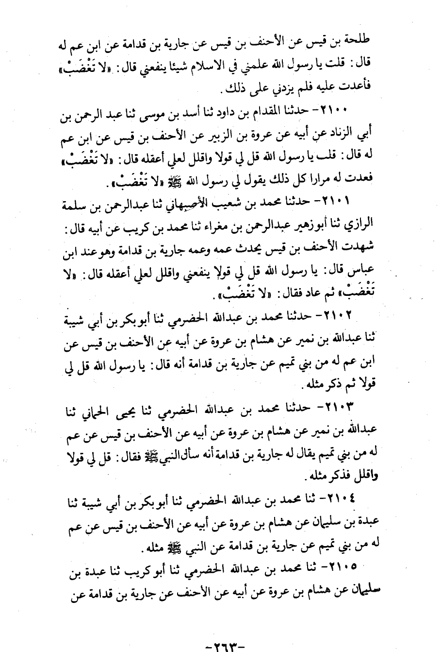 2100 - حَدَّثَنَا الْمِقْدَامُ بْنُ دَاوُدَ، ثنا أَسَدُ بْنُ مُوسَى، ثنا عَبْدُ الرَّحْمَنِ بْنُ أَبِي الزِّنَادِ، عَنْ أَبِيهِ، عَنْ عُرْوَةَ بْنِ الزُّبَيْرِ، عَنِ الْأَحْنَفِ بْنِ قَيْسٍ، عَنِ ابْنِ عَمٍّ، لَهُ قَالَ: قُلْتُ: يَا رَسُولَ اللهِ قُلْ لِي قَوْلًا وَاقْلِلْ لَعَلِّي أَعْقِلُهُ قَالَ: «§لَا تَغْضَبْ» فَعُدْتُ لَهُ مِرَارًا كُلَّ ذَلِكَ يَقُولُ لِي رَسُولُ اللهِ صَلَّى اللهُ عَلَيْهِ وَسَلَّمَ: «لَا تَغْضَبْ»