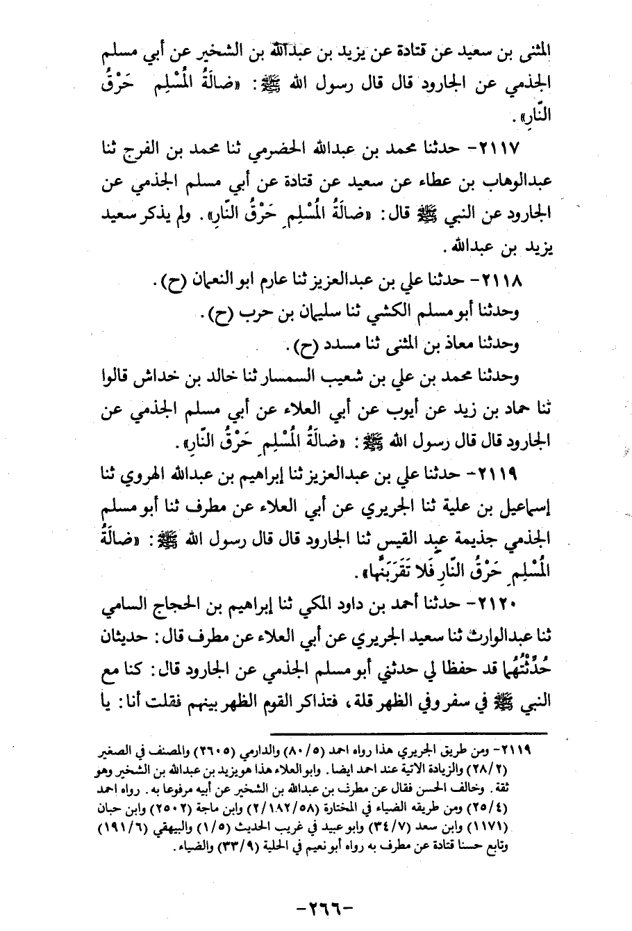 2118 - حَدَّثَنَا عَلِيُّ بْنُ عَبْدِ الْعَزِيزِ، ثنا عَارِمُ أَبُو النُّعْمَانِ، ح وَحَدَّثَنَا أَبُو مُسْلِمٍ الْكَشِّيُّ، ثنا سُلَيْمَانُ بْنُ حَرْبٍ، ح وَحَدَّثَنَا مُعَاذُ بْنُ الْمُثَنَّى، ثنا مُسَدَّدٌ، ح وَحَدَّثَنَا مُحَمَّدُ بْنُ عَلِيِّ بْنِ شُعَيْبٍ السِّمْسَارُ، ثنا خَالِدُ بْنُ خِدَاشٍ، قَالُوا: ثنا حَمَّادُ بْنُ زَيْدٍ، عَنْ أَيُّوبَ، عَنْ أَبِي الْعَلَاءِ، عَنْ أَبِي مُسْلِمٍ الْجَذْمِيِّ، عَنِ الْجَارُودِ، قَالَ: قَالَ رَسُولُ اللهِ صَلَّى اللهُ عَلَيْهِ وَسَلَّمَ: «§ضَالَّةُ الْمُسْلِمِ حَرْقُ النَّارِ»