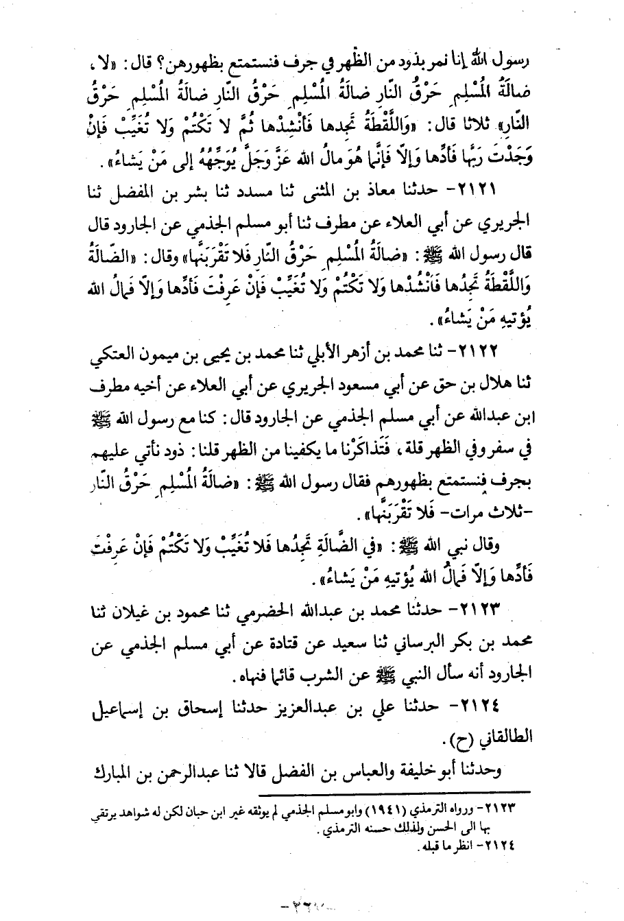 2121 - حَدَّثَنَا مُعَاذُ بْنُ الْمُثَنَّى، ثنا مُسَدَّدٌ، ثنا بِشْرُ بْنُ الْمُفَضَّلِ، ثنا الْجُرَيْرِيُّ، عَنْ أَبِي الْعَلَاءِ، عَنْ مُطَرِّفٍ، ثنا أَبُو مُسْلِمٍ الْجَذْمِيُّ، عَنِ الْجَارُودِ، قَالَ: قَالَ رَسُولُ اللهِ صَلَّى اللهُ عَلَيْهِ وَسَلَّمَ: «ضَالَّةُ الْمُسْلِمِ حَرْقُ النَّارِ فَلَا تَقْرَبَنَّهَا» ، وَقَالَ: «§الضَّالَّةُ وَاللُّقَطَةُ تَجِدُهَا فَانْشُدْهَا وَلَا تَكْتُمْ وَلَا تُغَيِّبْ، فَإِنْ عَرَفْتَ فَأَدِّهَا، وَإِلَّا فَمَالُ اللهِ يُؤْتِيهِ مَنْ يَشَاءُ»