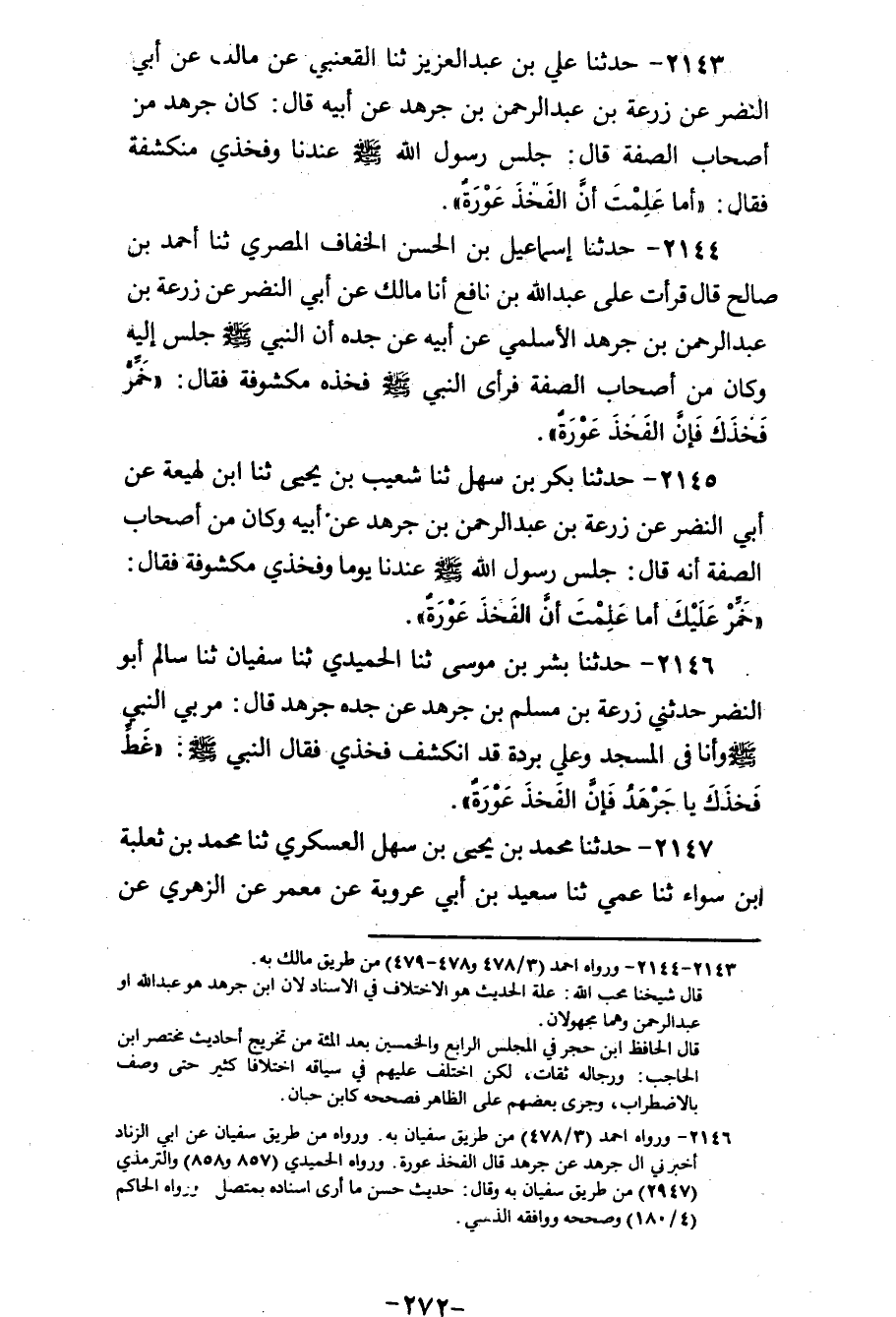 2146 - حَدَّثَنَا بِشْرُ بْنُ مُوسَى، ثنا الْحُمَيْدِيُّ، ثنا سُفْيَانُ، ثنا سَالِمٌ أَبُو النَّضْرِ، حَدَّثَنِي زُرْعَةُ بْنُ عَبْدِ الرَّحْمَنِ بْنِ جَرْهَدٍ، عَنْ جَدِّهِ جَرْهَدٍ، قَالَ: مَرَّ بِيَ النَّبِيُّ صَلَّى اللهُ عَلَيْهِ وَسَلَّمَ وَأَنَا فِي الْمَسْجِدِ وَعَلَيَّ بُرْدَةٌ قَدِ انْكَشَفَتْ فَخِذِي، فَقَالَ النَّبِيُّ صَلَّى اللهُ عَلَيْهِ وَسَلَّمَ: «§غَطِّ فَخِذَكَ يَا جَرْهَدُ فَإِنَّ الْفَخِذَ عَوْرَةٌ»