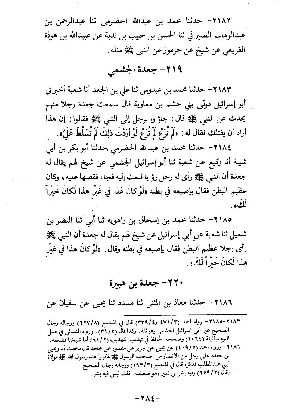 2184 - حَدَّثَنَا مُحَمَّدُ بْنُ عَبْدِ اللهِ الْحَضْرَمِيُّ، حَدَّثَنَا أَبُو بَكْرِ بْنُ أَبِي شَيْبَةَ، أنا وَكِيعٌ، عَنْ شُعْبَةَ، ثنا أَبُو إِسْرَائِيلَ الْجُشَمِيُّ، عَنْ شَيْخٍ لَهُمْ يُقَالُ لَهُ جَعْدَةُ أَنَّ النَّبِيَّ صَلَّى اللهُ عَلَيْهِ وَسَلَّمَ رَأَى لَهُ رَجُلٌ رُؤْيَا فَبَعَثَ إِلَيْهِ فَجَاءَ فَقَصَّهَا عَلَيْهِ وَكَانَ عَظِيمَ الْبَطْنِ، فَقَالَ بِإِصْبَعِهِ فِي بَطْنِهِ: «§لَوْ كَانَ هَذَا فِي غَيْرِ هَذَا لَكَانَ خَيْرًا لَكَ»