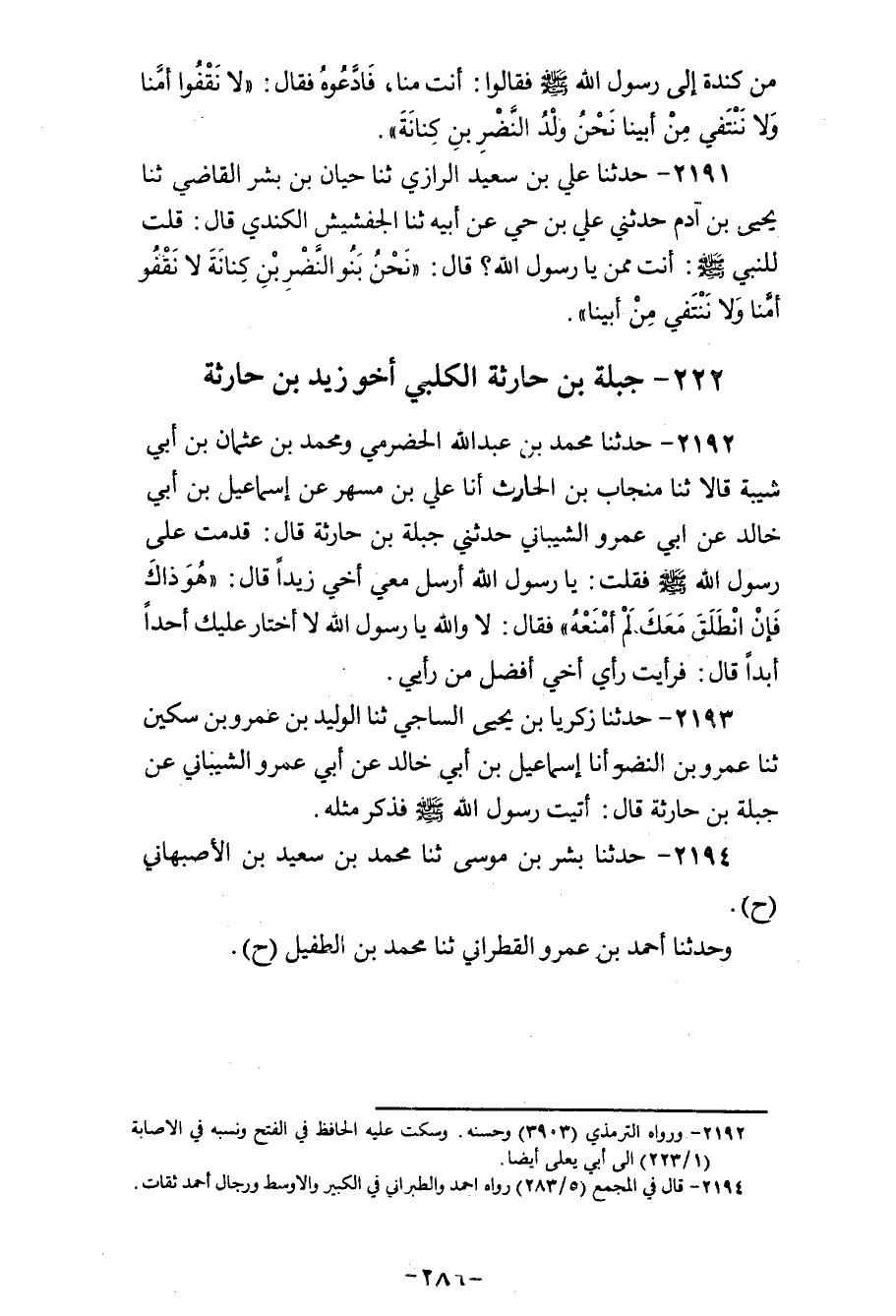 2194 - حَدَّثَنَا بِشْرُ بْنُ مُوسَى، ثنا مُحَمَّدُ بْنُ سَعِيدِ بْنِ الْأَصْبَهَانِيِّ، ح، وَحَدَّثَنَا أَحْمَدُ بْنُ عَمْرٍو الْقَطِرَانِيُّ، ثنا مُحَمَّدُ بْنُ الطُّفَيْلِ، ح، وَحَدَّثَنَا مُحَمَّدُ بْنُ عَبْدِ اللهِ الْحَضْرَمِيُّ، ثنا يَحْيَى الْحِمَّانِيُّ، قَالُوا:، ثنا شَرِيكٌ، عَنْ أَبِي إِسْحَاقَ، عَنْ جَبَلَةَ بْنِ حَارِثَةَ، قَالَ: «كَانَ النَّبِيُّ صَلَّى اللهُ عَلَيْهِ وَسَلَّمَ §إِذَا لَمْ يَغْزُ أَعْطَى سِلَاحَهُ عَلِيًّا أَوْ أُسَامَةَ رَضِي اللهُ عَنْهُمَا»