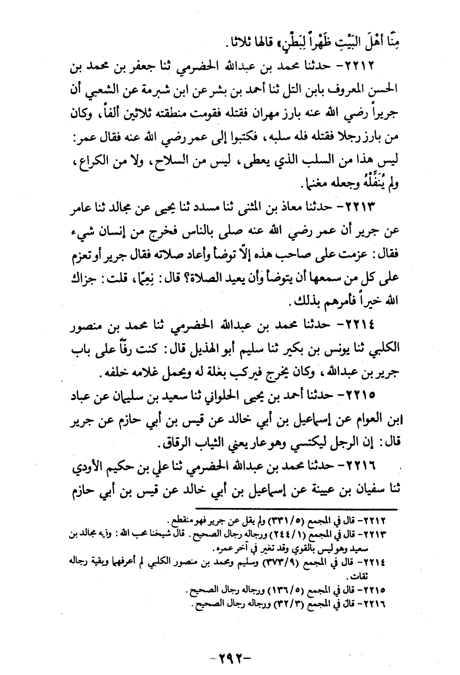 2213 - حَدَّثَنَا مُعَاذُ بْنُ الْمُثَنَّى، ثنا مُسَدَّدٌ، ثنا يَحْيَى، عَنْ مُجَالِدٍ، ثنا عَامِرٌ، عَنْ جَرِيرٍ: " أَنَّ عُمَرَ رَضِي اللهُ عَنْهُ §صَلَّى بِالنَّاسِ فَخَرَجَ مِنْ إِنْسَانٍ شَيْءٌ فَقَالَ: عَزَمْتُ عَلَى صَاحِبِ هَذه إِلَّا تَوَضَّأَ وَأَعَادَ صَلَاتَهُ، فَقَالَ جَرِيرٌ: أَوَ تَعْزِمُ عَلَى كُلِّ مَنْ سَمِعَهَا أَنْ يَتَوَضَّأَ وَأَنْ يُعِيدَ الصَّلَاةَ، قَالَ: نِعِمَّا، قُلْتُ: جَزَاكَ اللهُ خَيْرًا فَأَمَرَهُمْ بِذَلِكَ "