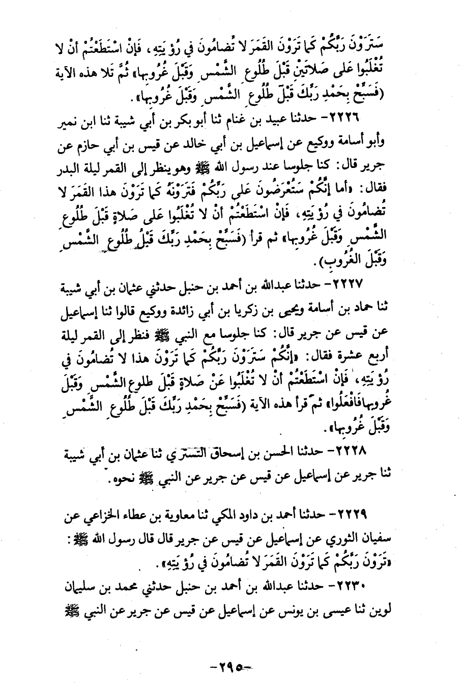 2226 - حَدَّثَنَا عُبَيْدُ بْنُ غَنَّامٍ، ثنا أَبُو بَكْرِ بْنُ أَبِي شَيْبَةَ، ثنا ابْنُ نُمَيْرٍ، وَأَبُو أُسَامَةَ، وَوَكِيعٌ، عَنْ إِسْمَاعِيلَ بْنِ أَبِي خَالِدٍ، عَنْ قَيْسِ بْنِ أَبِي حَازِمٍ، عَنْ جَرِيرٍ، قَالَ: كُنَّا جُلُوسًا عِنْدَ رَسُولِ اللهِ صَلَّى اللهُ عَلَيْهِ وَسَلَّمَ وَهُوَ يَنْظُرُ إِلَى الْقَمَرِ لَيْلَةَ الْبَدْرِ فَقَالَ: «أَمَا إِنَّكُمْ §سَتُعْرَضُونَ عَلَى رَبِّكُمْ فَتَرَوْنَهُ كَمَا تَرَوْنَ هَذَا الْقَمَرَ لَا تُضَامُونَ فِي رُؤْيَتِهِ، فَإِنِ اسْتَطَعْتُمْ أَنْ لَا تُغْلَبُوا عَلَى صَلَاةٍ قَبْلَ طُلُوعِ الشَّمْسِ وَقَبْلَ غُرُوبِهَا» ثُمَّ قَرَأَ: {وَسَبِّحْ بِحَمْدِ رَبِّكَ قَبْلَ طُلُوعِ الشَّمْسِ وَقَبْلَ الْغُرُوبِ} [ق: 39]