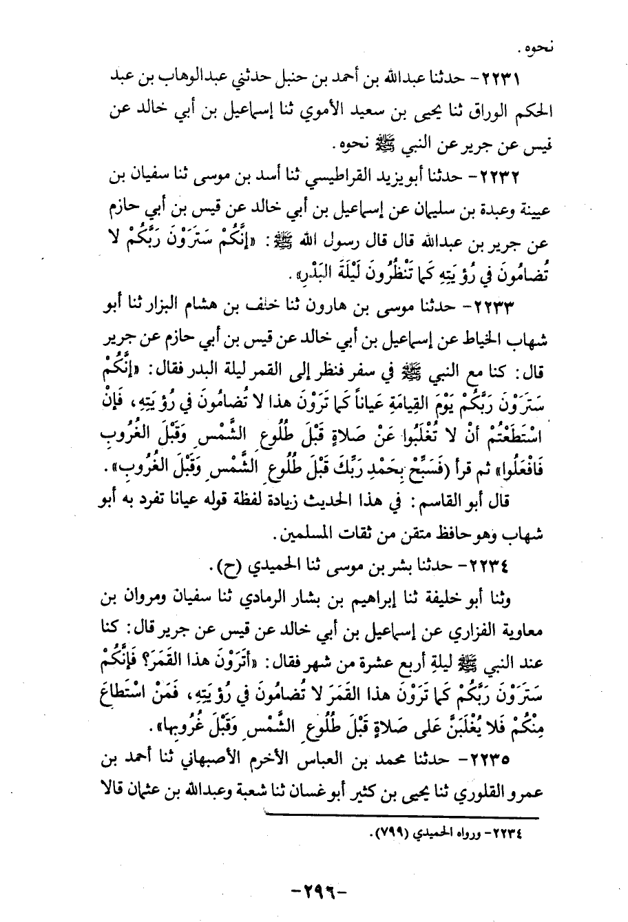 2234 - حَدَّثَنَا بِشْرُ بْنُ مُوسَى، ثنا الْحُمَيْدِيُّ، ح وثنا أَبُو خَلِيفَةَ، ثنا إِبْرَاهِيمُ بْنُ بَشَّارٍ الرَّمَادِيُّ، ثنا سُفْيَانُ، وَمَرْوَانُ بْنُ مُعَاوِيَةَ الْفَزَارِيُّ، عَنْ إِسْمَاعِيلَ بْنِ أَبِي خَالِدٍ، عَنْ قَيْسٍ، عَنْ جَرِيرٍ، قَالَ: كُنَّا عِنْدَ النَّبِيِّ صَلَّى اللهُ عَلَيْهِ وَسَلَّمَ لَيْلَةَ أَرْبَعَ عَشْرَةَ مِنْ شَهْرٍ، فَقَالَ: «أَتَرَوْنَ هَذَا الْقَمَرَ؟ فَإِنَّكُمْ §سَتَرَوْنَ رَبَّكُمْ كَمَا تَرَوْنَ هَذَا الْقَمَرَ لَا تُضَامُونَ فِي رُؤْيَتِهِ فَمَنِ اسْتَطَاعَ مِنْكُمْ فَلَا يُغْلَبَنَّ عَلَى صَلَاةٍ قَبْلَ طُلُوعِ الشَّمْسِ وَقَبْلَ غُرُوبِهَا»