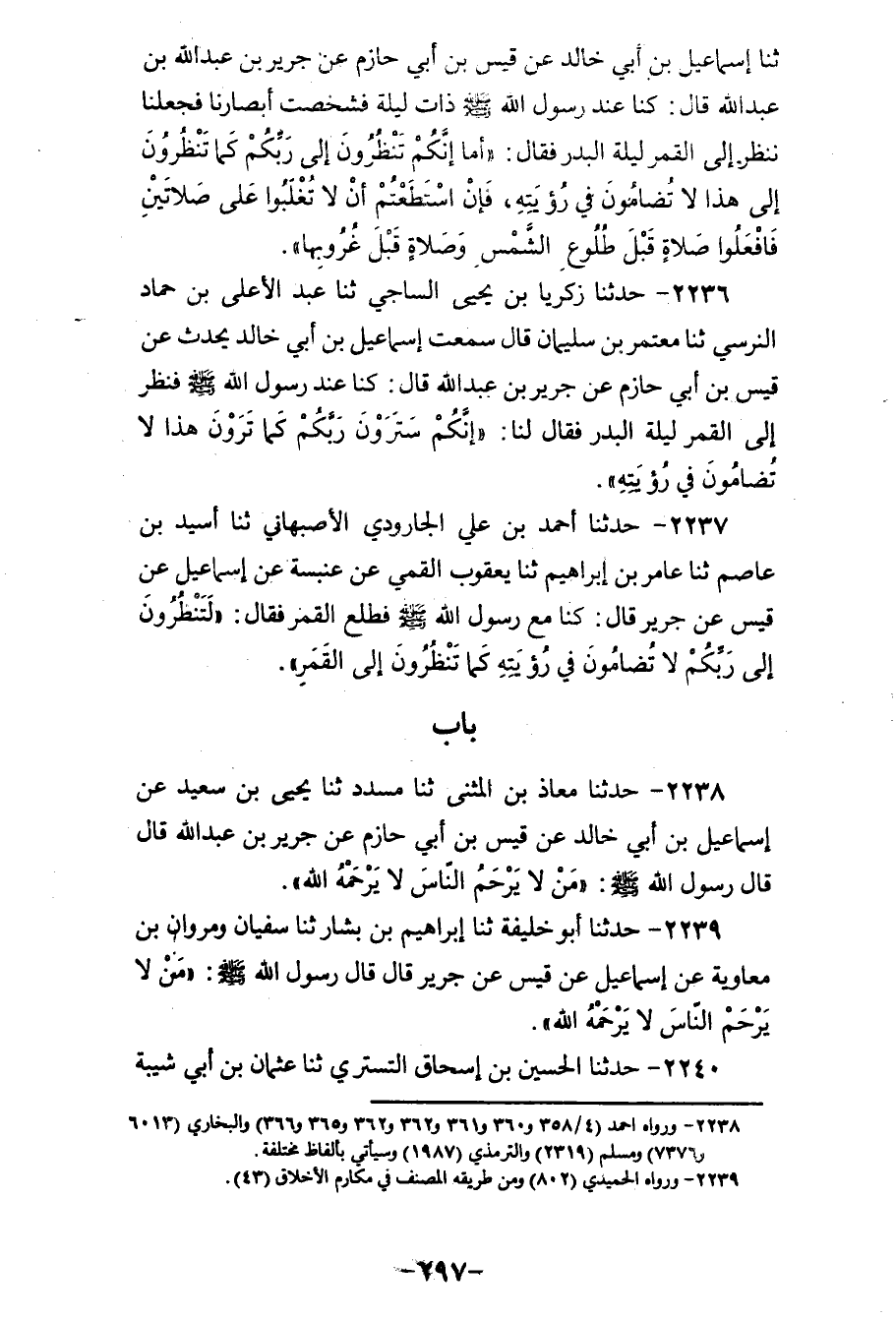 2236 - حَدَّثَنَا زَكَرِيَّا بْنُ يَحْيَى السَّاجِيُّ، ثنا عَبْدُ الْأَعْلَى بْنُ حَمَّادٍ النَّرْسِيُّ، ثنا مُعْتَمِرُ بْنُ سُلَيْمَانَ، قَالَ: سَمِعْتُ إِسْمَاعِيلَ بْنَ أَبِي خَالِدٍ يُحَدِّثُ، عَنْ قَيْسِ بْنِ أَبِي حَازِمٍ، عَنْ جَرِيرِ بْنِ عَبْدِ اللهِ، قَالَ: كُنَّا عِنْدَ رَسُولِ اللهِ صَلَّى اللهُ عَلَيْهِ وَسَلَّمَ فَنَظَرَ إِلَى الْقَمَرِ لَيْلَةَ الْبَدْرِ، فَقَالَ لَنَا: «إِنَّكُمْ §سَتَرَوْنَ رَبَّكُمْ كَمَا تَرَوْنَ هَذَا لَا تُضَامُونَ فِي رُؤْيَتِهِ»