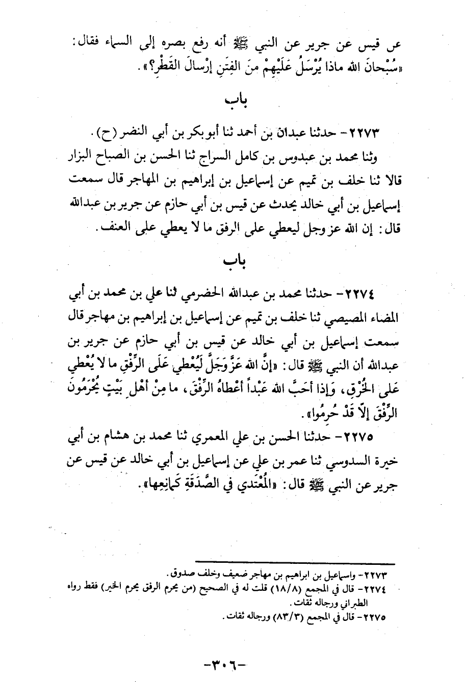 2273 - حَدَّثَنَا عَبْدَانُ بْنُ أَحْمَدَ، ثنا أَبُو بَكْرِ بْنُ أَبِي النَّضْرِ، وثنا مُحَمَّدُ بْنُ عَبْدُوسِ بْنِ كَامِلٍ السِّرَاجُ، ثنا الْحَسَنُ بْنُ الصَّبَّاحِ الْبَزَّارُ، قَالَا: ثنا خَلَفُ بْنُ تَمِيمٍ، عَنْ إِسْمَاعِيلَ بْنِ إِبْرَاهِيمَ بْنِ الْمُهَاجِرِ، قَالَ: سَمِعْتُ إِسْمَاعِيلَ بْنَ أَبِي خَالِدٍ، يُحَدِّثُ عَنْ قَيْسِ بْنِ أَبِي حَازِمٍ، عَنْ جَرِيرِ بْنِ عَبْدِ اللهِ، قَالَ: «إِنَّ §اللهَ عَزَّ وَجَلَّ لَيُعْطِي عَلَى الرِّفْقِ مَا لَا يُعْطِي عَلَى الْعُنْفِ»