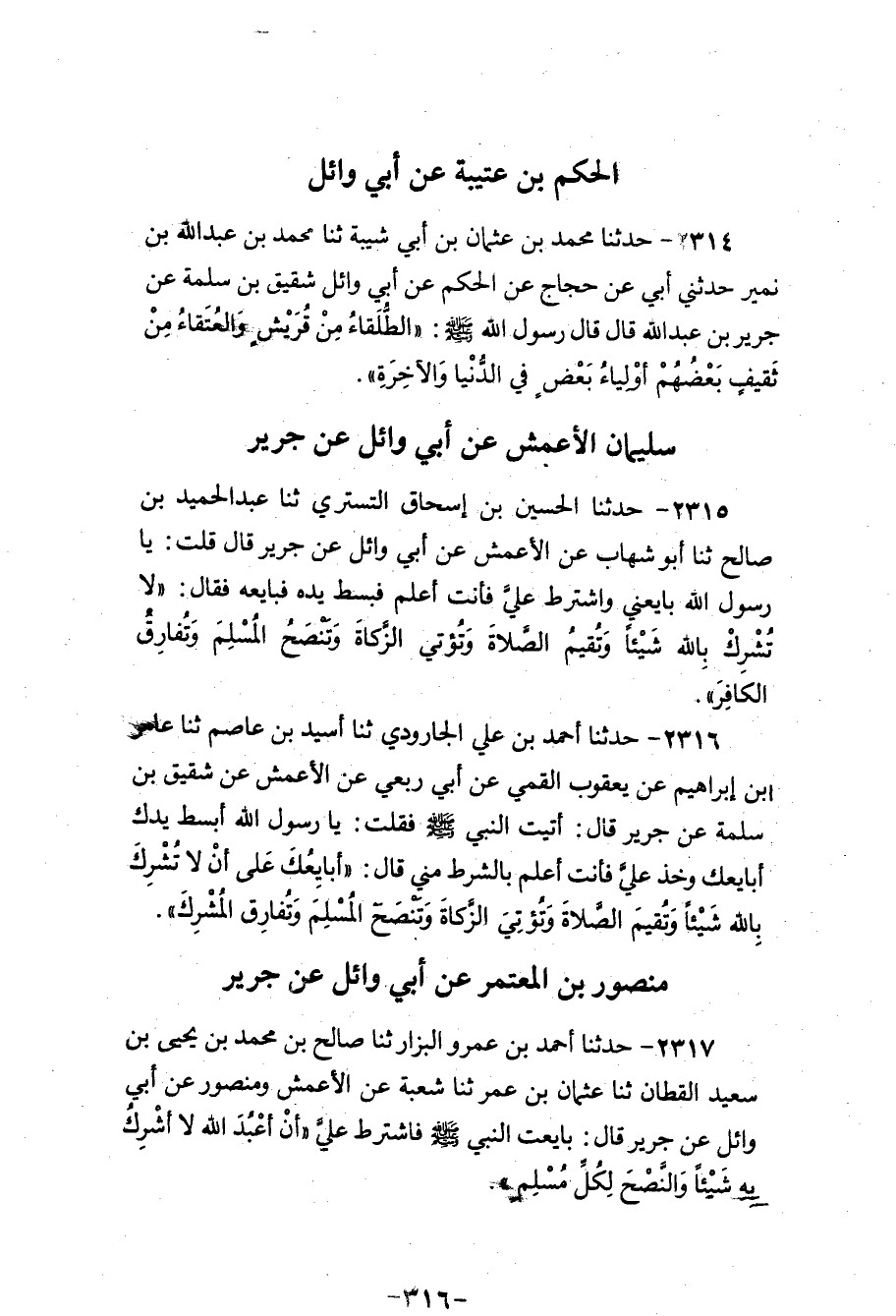 2316 - حَدَّثَنَا أَحْمَدُ بْنُ عَلِيٍّ الْجَارُودِيُّ، ثنا أُسَيْدُ بْنُ عَاصِمٍ، ثنا عَامِرُ بْنُ إِبْرَاهِيمَ، عَنْ يَعْقُوبَ الْقُمِّيِّ، عَنْ أَبِي رِبْعِيٍّ، عَنِ الْأَعْمَشِ، عَنْ شَقِيقِ بْنِ سَلَمَةَ، عَنْ جَرِيرٍ، قَالَ: أَتَيْتُ النَّبِيَّ صَلَّى اللهُ عَلَيْهِ وَسَلَّمَ فَقُلْتُ: يَا رَسُولَ اللهِ ابْسُطْ يَدَكَ أُبَايِعْكَ وَخُذْ عَلَيَّ فَأَنْتَ أَعْلَمُ بِالشَّرْطِ مِنِّي، قَالَ: «أُبَايِعُكَ عَلَى أَنْ §لَا تُشْرِكَ بِاللهِ شَيْئًا، وَتُقِيمَ الصَّلَاةَ، وَتُؤْتِيَ الزَّكَاةَ، وَتَنْصَحَ الْمُسْلِمَ، وَتُفَارِقَ الْمُشْرِكَ»