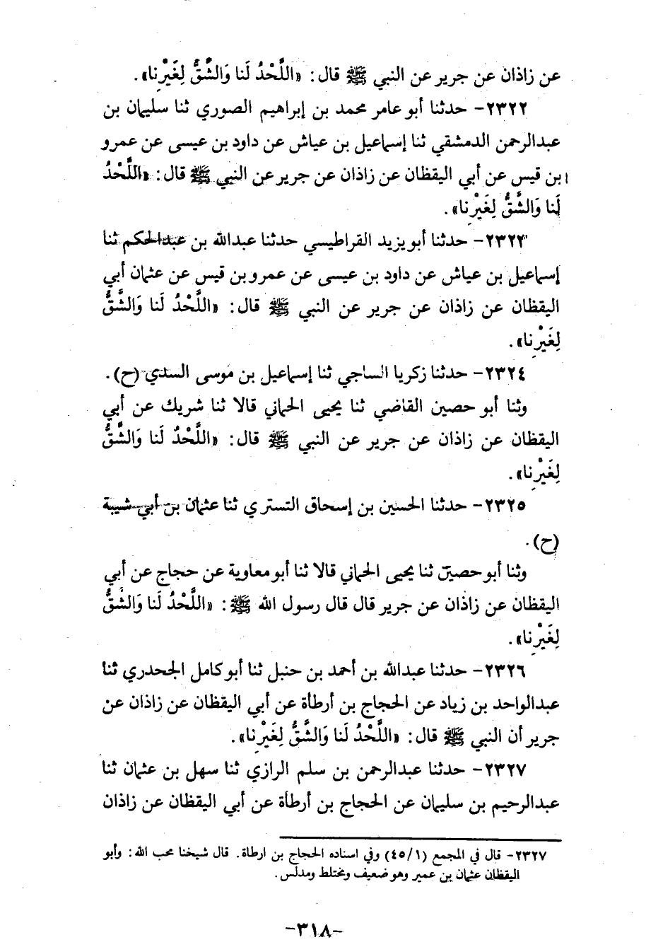 2325 - حَدَّثَنَا الْحُسَيْنُ بْنُ إِسْحَاقَ التُّسْتَرِيُّ، ثنا عُثْمَانُ بْنُ أَبِي شَيْبَةَ، ح وثنا أَبُو حُصَيْنٍ، ثنا يَحْيَى الْحِمَّانِيُّ، قَالَا: ثنا مُعَاوِيَةُ، عَنْ حَجَّاجٍ، عَنْ أَبِي الْيَقْظَانِ، عَنْ زَاذَانَ، عَنْ جَرِيرٍ، عَنِ النَّبِيِّ صَلَّى اللهُ عَلَيْهِ وَسَلَّمَ قَالَ: «§اللَّحْدُ لَنَا وَالشَّقُّ لِغَيْرِنَا»
