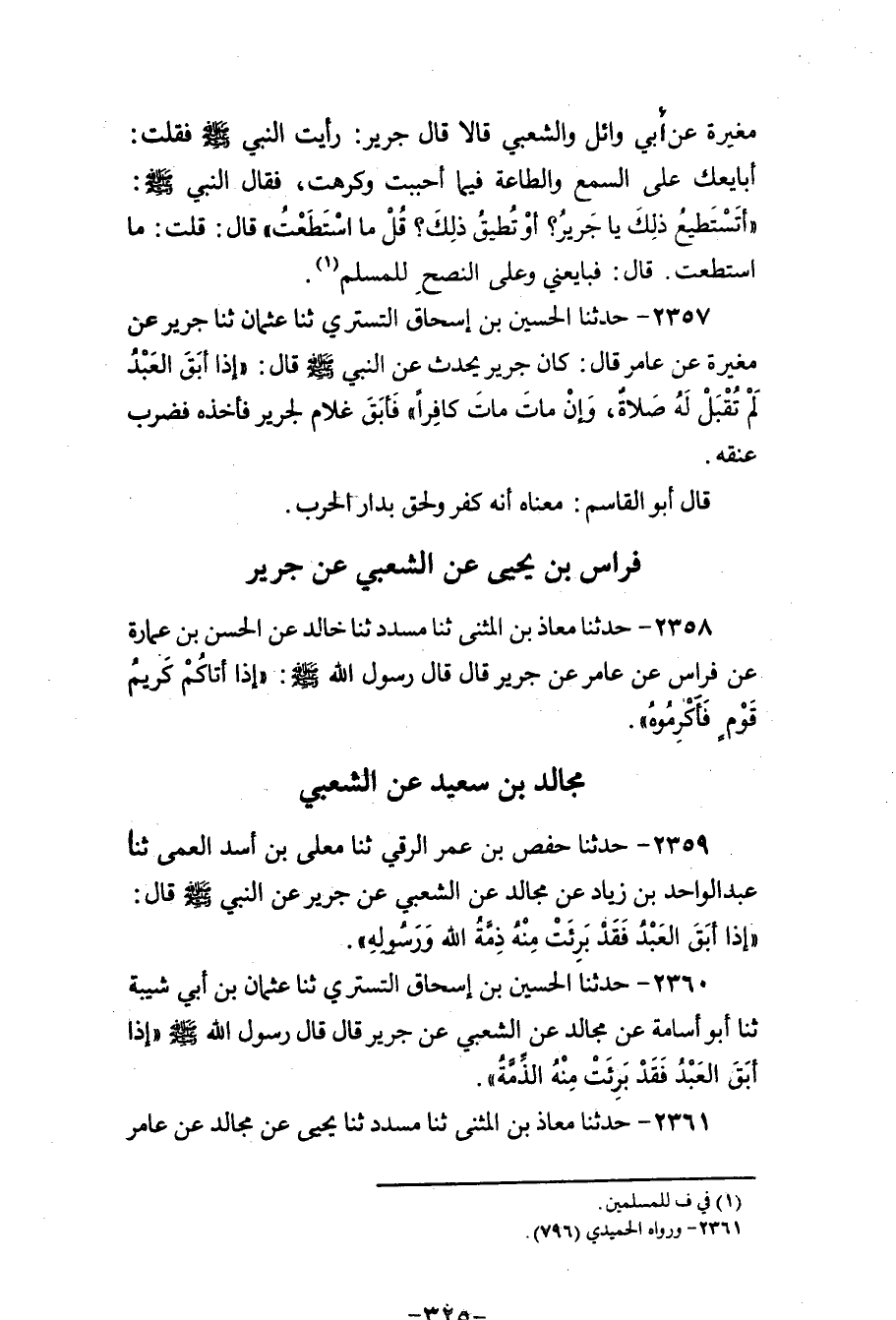 2359 - حَدَّثَنَا حَفْصُ بْنُ عُمَرَ الرَّقِّيُّ، ثنا مُعَلَّى بْنُ أَسَدٍ الْعَمِّيُّ، ثنا عَبْدُ الْوَاحِدِ بْنُ زِيَادٍ، عَنْ مُجَالِدٍ، عَنِ الشَّعْبِيِّ، عَنْ جَرِيرٍ، عَنِ النَّبِيِّ صَلَّى اللهُ عَلَيْهِ وَسَلَّمَ قَالَ: «§إِذَا أَبَقَ الْعَبْدُ فَقَدْ بَرِئَتْ مِنْهُ ذِمَّةُ اللهِ وَرَسُولُهُ»