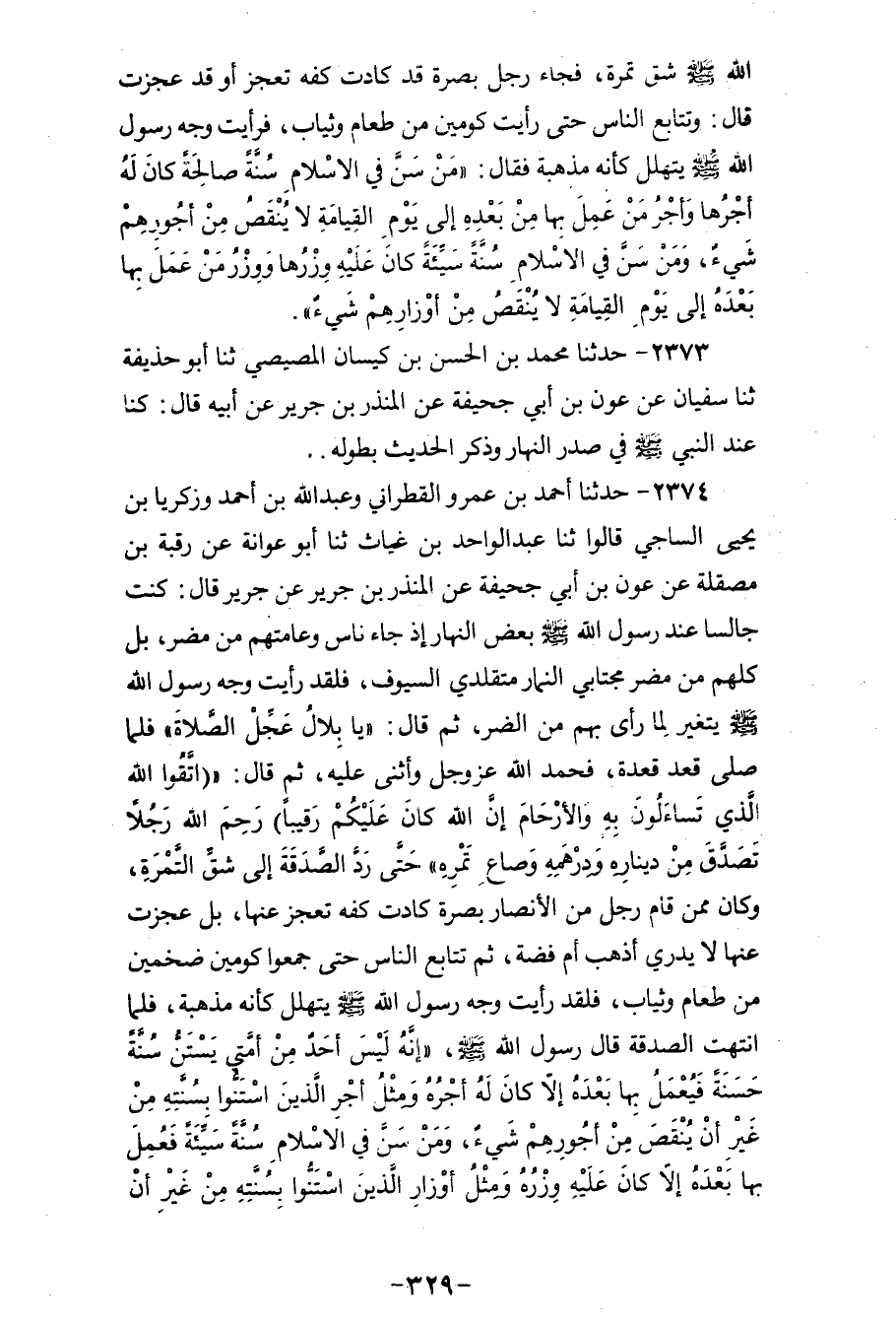 2374 - حَدَّثَنَا أَحْمَدُ بْنُ عَمْرٍو الْقَطِرَانِيُّ، وَعَبْدُ اللهِ بْنُ أَحْمَدَ، وَزَكَرِيَّا بْنُ يَحْيَى السَّاجِيُّ، قَالُوا: ثنا عَبْدُ الْوَاحِدِ بْنُ غِيَاثٍ، ثنا أَبُو عَوَانَةَ، عَنْ رَقَبَةَ بْنِ مَصْقَلَةَ، عَنْ عَوْنِ بْنِ أَبِي جُحَيْفَةَ، عَنِ الْمُنْذِرِ بْنِ جَرِيرٍ، عَنْ جَرِيرٍ، قَالَ: كُنْتُ جَالِسًا عِنْدَ رَسُولِ اللهِ صَلَّى اللهُ عَلَيْهِ وَسَلَّمَ بَعْضَ النَّهَارِ إِذْ جَاءَ نَاسٌ وَعَامَّتُهُمْ مِنْ مُضَرَ بَلْ كُلُّهُمْ مِنْ مُضَرَ، مُجْتَابِي النِّمَارِ مُتَقَلِّدِي السُّيُوفِ، فَلَقَدْ رَأَيْتُ وَجْهَ رَسُولِ اللهِ صَلَّى اللهُ عَلَيْهِ وَسَلَّمَ يَتَغَيَّرُ لَمَّا رَأَى بِهِمْ مِنَ الضُّرِّ، ثُمَّ قَالَ: «يَا بِلَالُ عَجِّلِ الصَّلَاةَ» ، فَلَمَّا صَلَّى قَعَدَ قَعْدَةً فَحَمِدَ اللهَ عَزَّ وَجَلَّ وَأَثْنَى عَلَيْهِ، ثُمَّ قَالَ: {اتَّقُوا اللهَ الَّذِي تَسَاءَلُونَ بِهِ وَالْأَرْحَامَ إِنَّ اللهَ كَانَ عَلَيْكُمْ رَقِيبًا} [النساء: 1] «رَحِمَ اللهُ رَجُلًا تَصَدَّقَ مِنْ دِينَارِهِ وَدِرْهَمِهِ وَصَاعِ تَمْرِهِ» حَتَّى رَدَّ الصَّدَقَةَ إِلَى شَقِّ التَّمْرَةِ، وَكَانَ مِمَّنْ قَامَ رَجُلٌ مِنَ الْأَنْصَارِ بِصُرَّةٍ كَادَتْ كَفُّهُ تَعْجِزُ عَنْهَا، بَلْ عَجَزَتْ عَنْهَا لَا يَدْرِي أَذَهَبٌ أَمْ فِضَّةٌ، ثُمَّ تَتَابَعَ النَّاسُ حَتَّى جَمَعُوا كَوْمَيْنِ ضَخْمَيْنِ مِنْ طَعَامٍ وَثِيَابٍ، فَلَقَدْ رَأَيْتُ وَجْهَ رَسُولِ اللهِ صَلَّى اللهُ عَلَيْهِ وَسَلَّمَ يَتَهَلَّلُ كَأَنَّهُ مُذْهَبَةٌ، فَلَمَّا انْتَهَتِ الصَّدَقَةُ، قَالَ رَسُولُ اللهِ صَلَّى اللهُ عَلَيْهِ وَسَلَّمَ: «إِنَّهُ §لَيْسَ أَحَدٌ مِنْ أُمَّتِي يَسْتَنُّ سُنَّةً حَسَنَةً، فَيُعْمَلُ بِهَا بَعْدَهُ إِلَّا كَانَ لَهُ أَجْرُهُ وَمَثَلُ أَجْرِ الَّذِينَ اسْتَنَّوْا بِسُنَّتِهِ مِنْ غَيْرِ أَنْ يَنْقُصَ مِنْ أُجُورِهِمْ شَيْءٌ، وَمَنْ سَنَّ فِي الْإِسْلَامِ سُنَّةً سَيِّئَةً فَعُمِلَ بِهَا بَعْدَهُ إِلَّا كَانَ عَلَيْهِ وِزْرُهُ وَمِثْلُ أَوْزَارِ الَّذِينَ اسْتَنَّوْا بِسُنَّتِهِ مِنْ غَيْرِ أَنْ يَنْقُصَ مِنْ أَوْزَارِهِمْ شَيْءٌ»