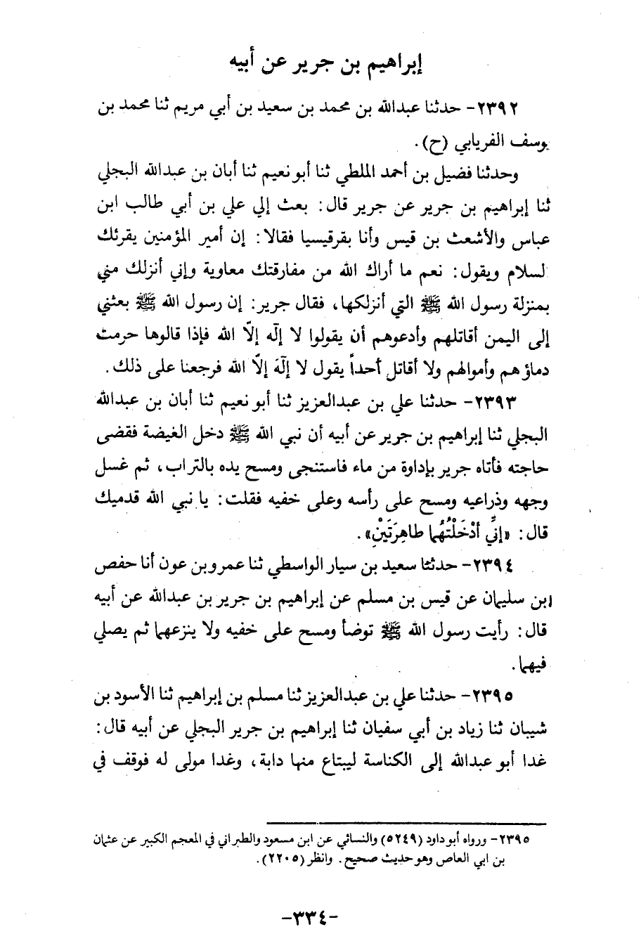 2394 - حَدَّثَنَا سَعِيدُ بْنُ سَيَّارٍ الْوَاسِطِيُّ، ثنا عَمْرُو بْنُ عَوْنٍ، أنا حَفْصُ بْنُ سُلَيْمَانَ، عَنْ قَيْسِ بْنِ مُسْلِمٍ، عَنْ إِبْرَاهِيمَ بْنِ جَرِيرِ بْنِ عَبْدِ اللهِ، عَنْ أَبِيهِ، قَالَ: «رَأَيْتُ رَسُولَ اللهِ صَلَّى اللهُ عَلَيْهِ وَسَلَّمَ §تَوَضَّأَ، وَمَسَحَ عَلَى خُفَّيْهِ، وَلَا يَنْزِعُهُمَا ثُمَّ يُصَلِّي فِيهِمَا»