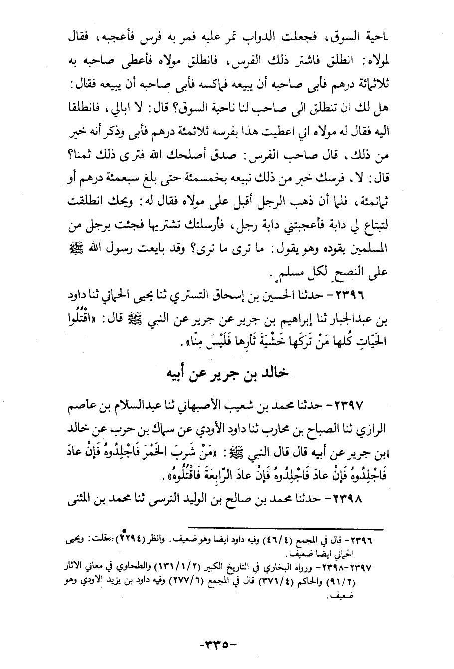 2397 - حَدَّثَنَا مُحَمَّدُ بْنُ شُعَيْبٍ الْأَصْبَهَانِيُّ، ثنا عَبْدُ السَّلَامِ بْنُ عَاصِمٍ الرَّازِيُّ، ثنا الصَّبَّاحُ بْنُ مُحَارِبٍ، ثنا دَاوُدُ الْأَوْدِيُّ، عَنْ سِمَاكِ بْنِ حَرْبٍ، عَنْ خَالِدِ بْنِ جَرِيرٍ، عَنْ أَبِيهِ، قَالَ: قَالَ النَّبِيُّ صَلَّى اللهُ عَلَيْهِ وَسَلَّمَ: «§مَنْ شَرِبَ الْخَمْرَ فَاجْلِدُوهُ، فَإِنْ عَادَ فَاجْلِدُوهُ، فَإِنْ عَادَ فَاجْلِدُوهُ، فَإِنْ عَادَ الرَّابِعَةَ فَاقْتُلُوهُ» ،