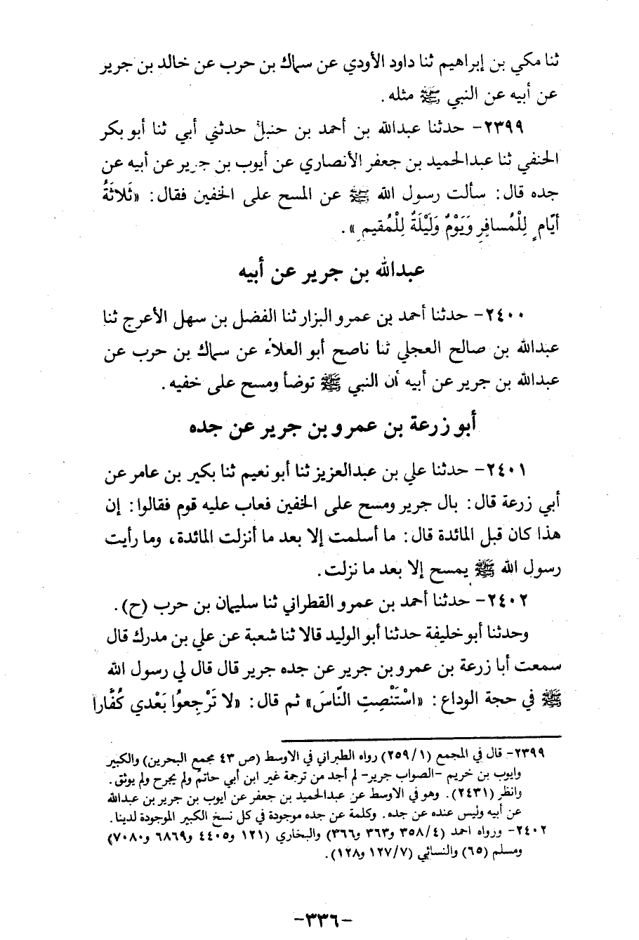 2399 - حَدَّثَنَا عَبْدُ اللهِ بْنُ أَحْمَدَ بْنِ حَنْبَلٍ، حَدَّثَنِي أَبِي، ثنا أَبُو بَكْرٍ الْحَنَفِيُّ، ثنا عَبْدُ الْحَمِيدِ بْنُ جَعْفَرٍ الْأَنْصَارِيُّ، عَنْ أَيُّوبَ بْنِ جَرِيرٍ، عَنْ أَبِيهِ قَالَ: سَأَلْتُ رَسُولَ اللهِ صَلَّى اللهُ عَلَيْهِ وَسَلَّمَ عَنِ الْمَسْحِ عَلَى الْخُفَّيْنِ، فَقَالَ: «§ثَلَاثَةُ أَيَّامٍ لِلْمُسَافِرِ، وَيَوْمٌ وَلَيْلَةٌ لِلْمُقِيمِ»