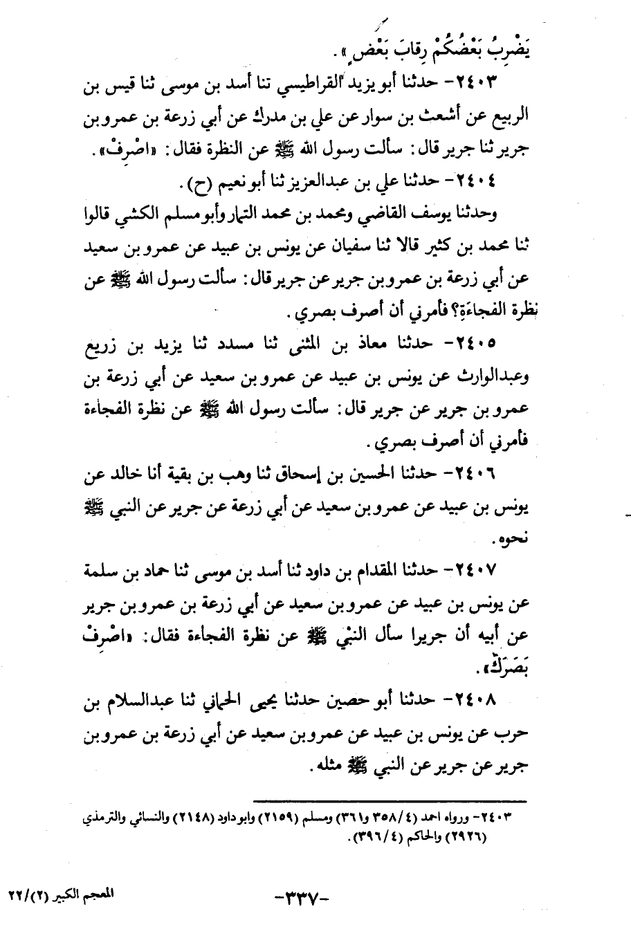 2404 - حَدَّثَنَا عَلِيُّ بْنُ عَبْدِ الْعَزِيزِ، ثنا أَبُو نُعَيْمٍ، ح وَحَدَّثَنَا يُوسُفُ الْقَاضِي، وَمُحَمَّدُ بْنُ مُحَمَّدٍ التَّمَّارُ، وَأَبُو مُسْلِمٍ الْكَشِّيُّ، قَالُوا: ثنا مُحَمَّدُ بْنُ كَثِيرٍ، قَالَا: ثنا سُفْيَانُ، عَنْ يُونُسَ بْنِ عُبَيْدٍ، عَنْ عَمْرِو بْنِ سَعِيدٍ، عَنْ أَبِي زُرْعَةَ بْنِ عَمْرِو بْنِ جَرِيرٍ، عَنْ جَرِيرٍ، قَالَ: سَأَلْتُ رَسُولَ اللهِ صَلَّى اللهُ عَلَيْهِ وَسَلَّمَ §عَنْ نَظْرَةِ الْفُجَاءَةِ؟ «فَأَمَرَنِي أَنْ أَصْرِفَ بَصَرِي»