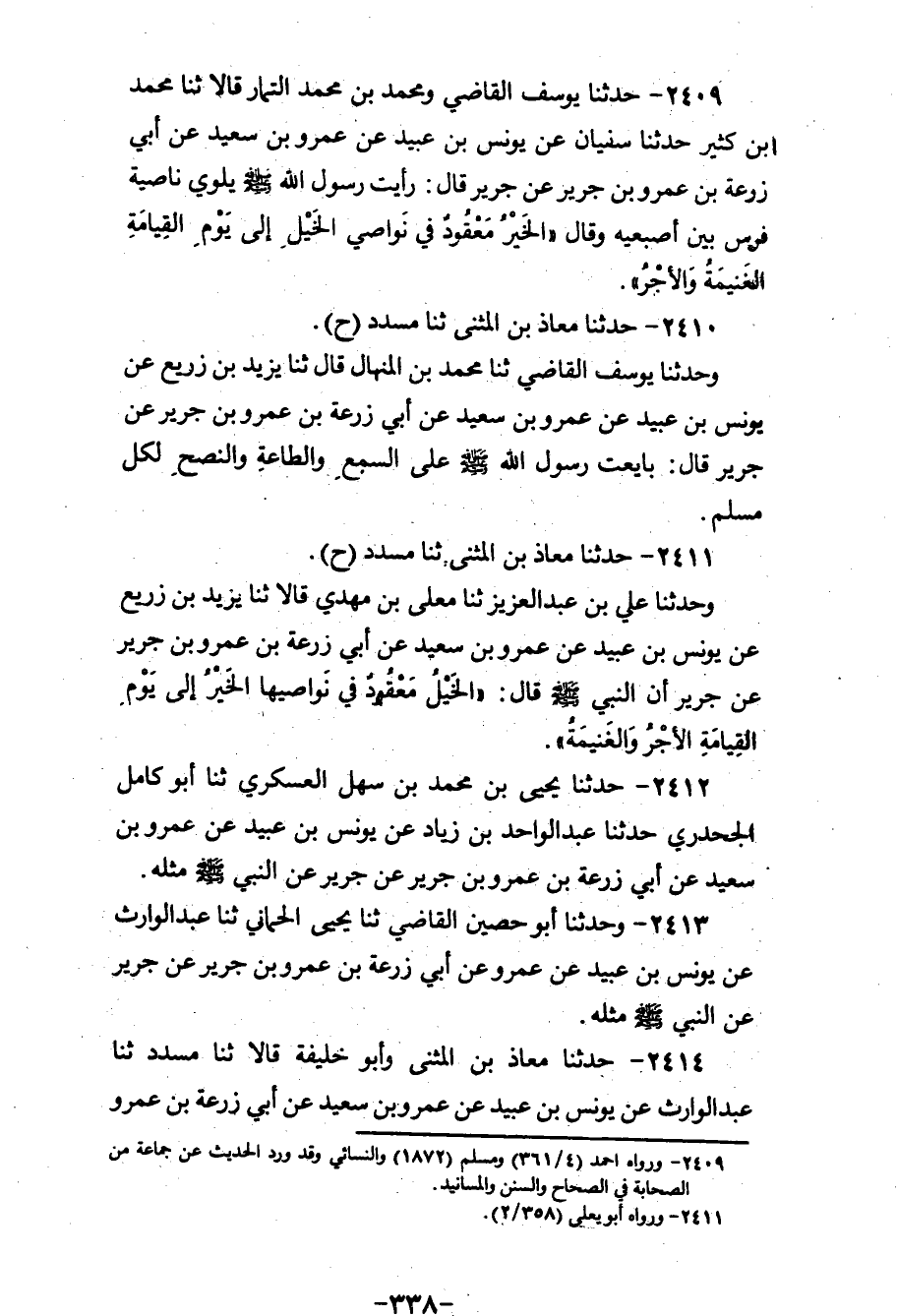 2411 - حَدَّثَنَا مُعَاذُ بْنُ الْمُثَنَّى، ثنا مُسَدَّدٌ، ح وَحَدَّثَنَا عَلِيُّ بْنُ عَبْدِ الْعَزِيزِ، ثنا مُعَلَّى بْنُ مَهْدِيٍّ، قَالَا: ثنا يَزِيدُ بْنُ زُرَيْعٍ، عَنْ يُونُسَ بْنِ عُبَيْدٍ، عَنْ عَمْرِو بْنِ سَعِيدٍ، عَنْ أَبِي زُرْعَةَ بْنِ عَمْرِو بْنِ جَرِيرٍ، عَنْ جَرِيرٍ، أَنَّ النَّبِيَّ صَلَّى اللهُ عَلَيْهِ وَسَلَّمَ قَالَ: «§الْخَيْلُ مَعْقُودٌ فِي نَوَاصِيهَا الْخَيْرُ إِلَى يَوْمِ الْقِيَامَةِ الْأَجْرُ وَالْغَنِيمَةُ»