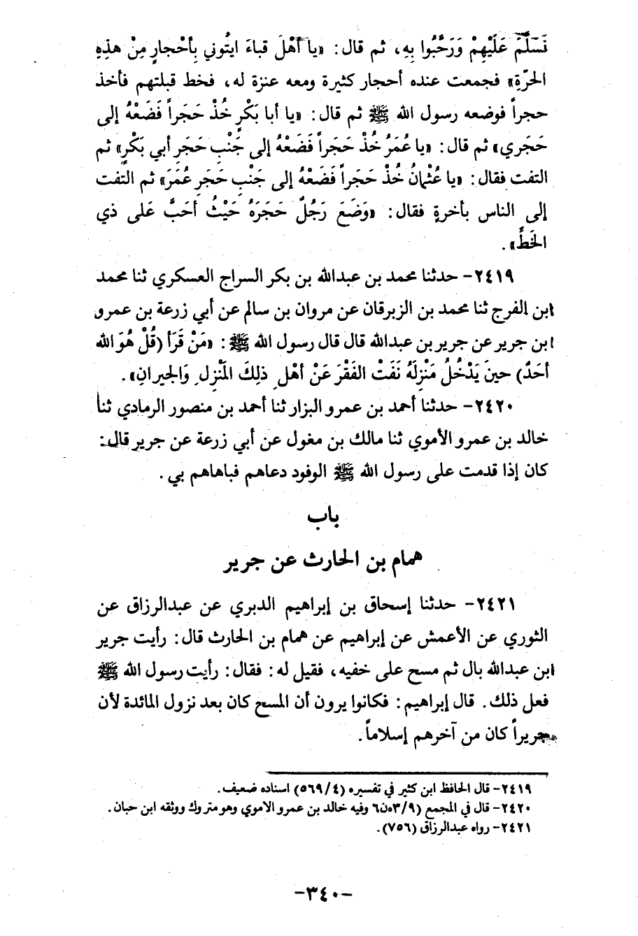 2421 - حَدَّثَنَا إِسْحَاقُ بْنُ إِبْرَاهِيمَ الدَّبَرِيُّ، عَنْ عَبْدِ الرَّزَّاقِ، عَنِ الثَّوْرِيِّ، عَنِ الْأَعْمَشِ، عَنْ إِبْرَاهِيمَ، عَنْ هَمَّامِ بْنِ الْحَارِثِ، قَالَ: رَأَيْتُ جَرِيرَ بْنَ عَبْدِ اللهِ، «§بَالَ ثُمَّ مَسَحَ عَلَى خُفَّيْهِ» فَقِيلَ لَهُ، فَقَالَ: «رَأَيْتُ رَسُولَ اللهِ صَلَّى اللهُ عَلَيْهِ وَسَلَّمَ فَعَلَ ذَلِكَ» قَالَ إِبْرَاهِيمُ: فَكَانُوا يَرَوْنَ أَنَّ الْمَسْحَ كَانَ بَعْدَ نُزُولِ الْمَائِدَةِ، لِأَنَّ جَرِيرًا كَانَ مِنْ آخِرِهِمْ إِسْلَامًا "