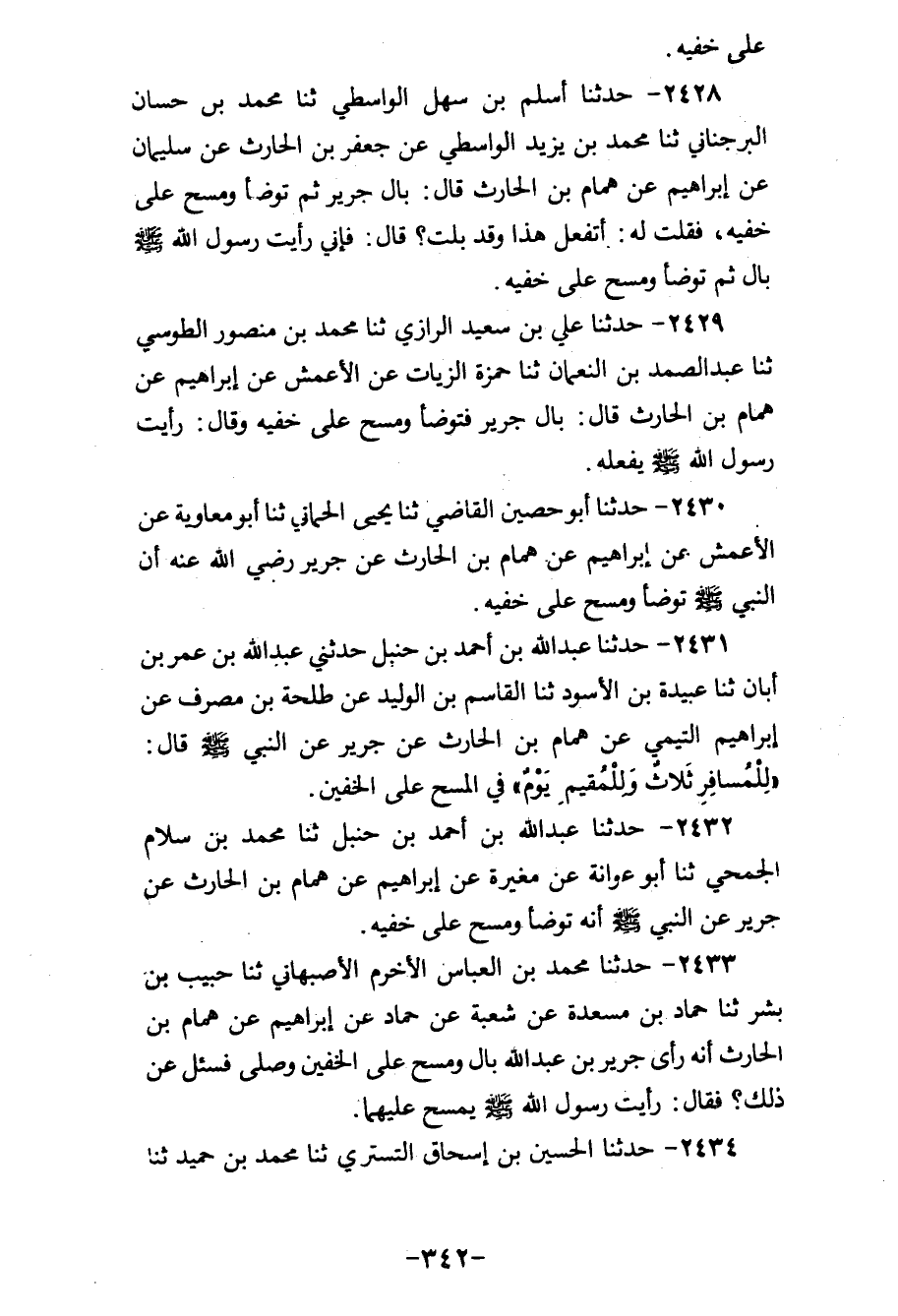 2433 - حَدَّثَنَا مُحَمَّدُ بْنُ الْعَبَّاسِ الْأَخْرَمُ الْأَصْبَهَانِيُّ، ثنا حَبِيبُ بْنُ بِشْرٍ، ثنا حَمَّادُ بْنُ مَسْعَدَةَ، عَنْ شُعْبَةَ، عَنْ حَمَّادٍ، عَنْ إِبْرَاهِيمَ، عَنْ هَمَّامِ بْنِ الْحَارِثِ، أَنَّهُ رَأَى جَرِيرَ بْنَ عَبْدِ اللهِ «§بَالَ، وَمَسَحَ عَلَى الْخُفَّيْنِ، وَصَلَّى» فَسُئِلَ عَنْ ذَلِكَ، فَقَالَ: «رَأَيْتُ رَسُولَ اللهِ صَلَّى اللهُ عَلَيْهِ وَسَلَّمَ يَمْسَحُ عَلَيْهِمَا»