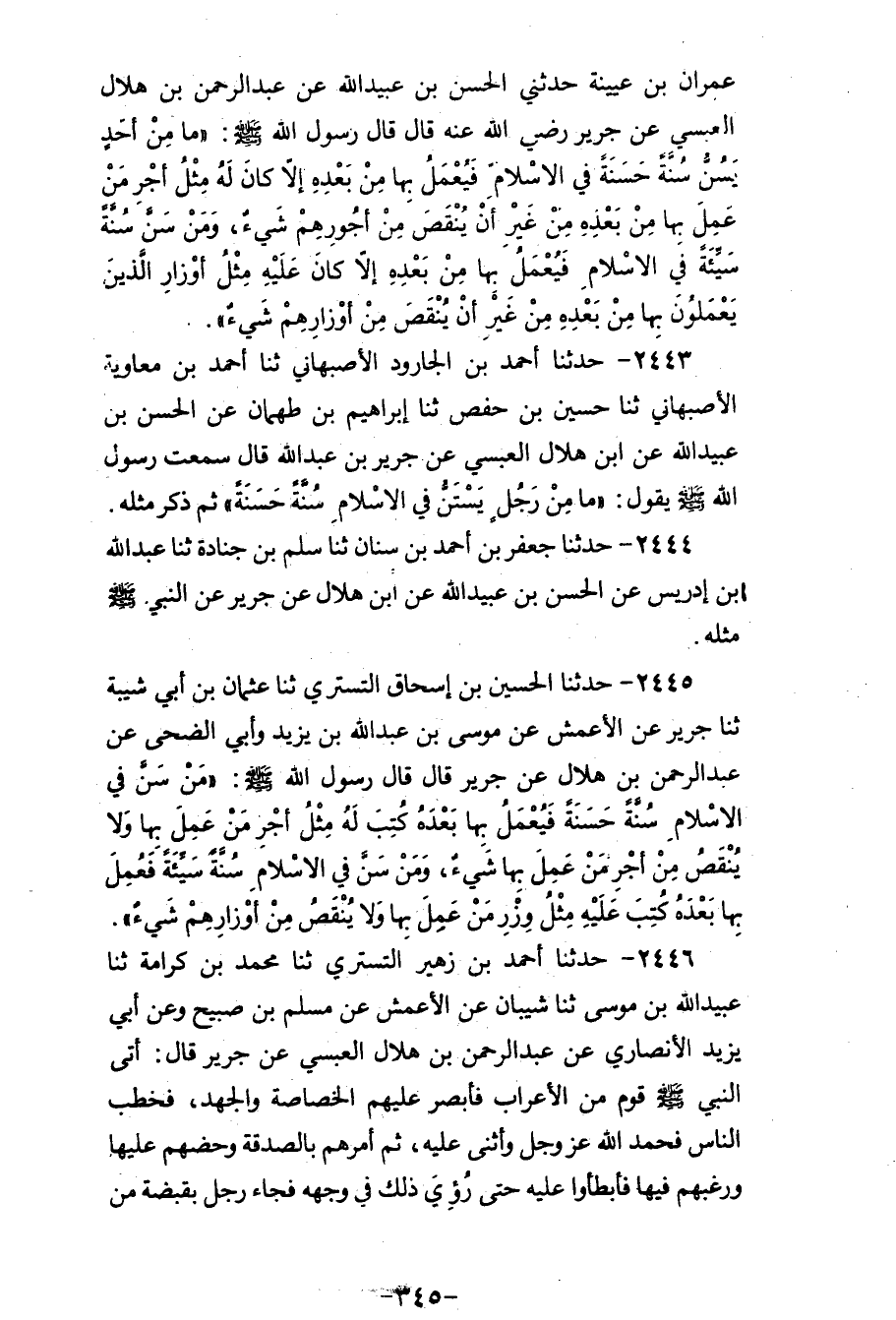 2445 - حَدَّثَنَا الْحُسَيْنُ بْنُ إِسْحَاقَ التُّسْتَرِيُّ، ثنا عُثْمَانُ بْنُ أَبِي شَيْبَةَ، ثنا جَرِيرٌ، عَنِ الْأَعْمَشِ، عَنْ مُوسَى بْنِ عَبْدِ اللهِ بْنِ يَزِيدَ، وَأَبِي الضُّحَى، عَنْ عَبْدِ الرَّحْمَنِ بْنِ هِلَالٍ، عَنْ جَرِيرٍ، قَالَ: قَالَ رَسُولُ اللهِ صَلَّى اللهُ عَلَيْهِ وَسَلَّمَ: «§مَنْ سَنَّ فِي الْإِسْلَامِ سُنَّةً حَسَنَةً فَيُعْمَلُ بِهَا بَعْدَهُ، كُتِبَ لَهُ مِثْلُ أَجْرِ مَنْ عَمِلَ بِهَا، وَلَا يَنْقُصُ مِنْ أَجْرِ مَنْ عَمِلَ بِهَا شَيْءٌ، وَمَنْ سَنَّ فِي الْإِسْلَامِ سُنَّةً سَيِّئَةً فَعُمِلَ بِهَا بَعْدَهُ كُتِبَ عَلَيْهِ مِثْلُ وِزْرِ مَنْ عَمِلَ بِهَا، وَلَا يَنْقُصُ مِنْ أَوْزَارِهِمْ شَيْءٌ»