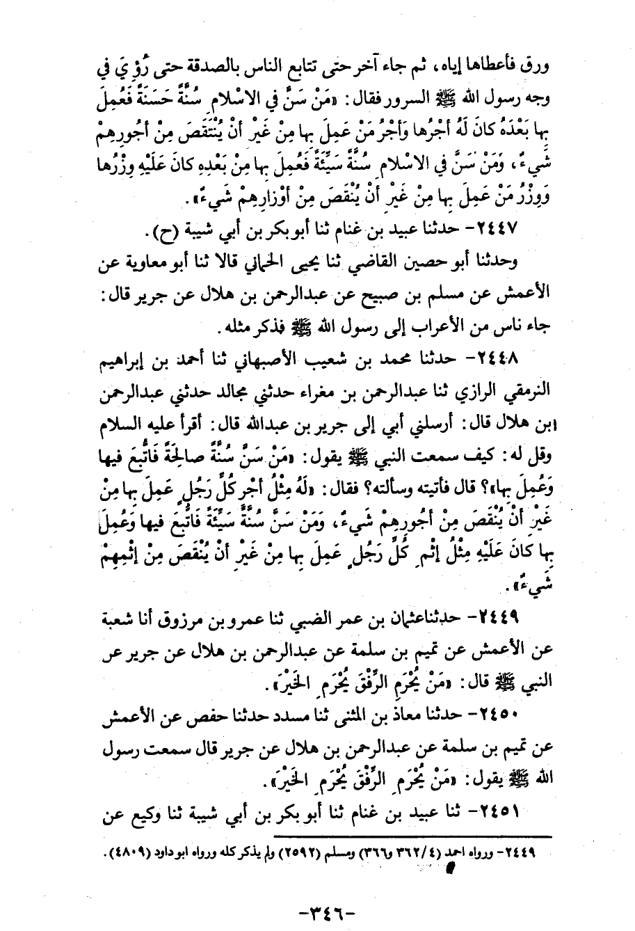 2448 - حَدَّثَنَا مُحَمَّدُ بْنُ شُعَيْبٍ الْأَصْبَهَانِيُّ، ثنا أَحْمَدُ بْنُ إِبْرَاهِيمَ النَّرْمَقِيُّ الرَّازِيُّ، ثنا عَبْدُ الرَّحْمَنِ بْنُ مَغْرَاءَ، حَدَّثَنِي مُجَالِدٌ، حَدَّثَنِي عَبْدُ الرَّحْمَنِ بْنُ هِلَالٍ، قَالَ: أَرْسَلَنِي أَبِي إِلَى جَرِيرِ بْنِ عَبْدِ اللهِ قَالَ: اقْرَأْ عَلَيْهِ السَّلَامَ وَقُلْ لَهُ: كَيْفَ سَمِعْتَ النَّبِيَّ صَلَّى اللهُ عَلَيْهِ وَسَلَّمَ يَقُولُ: «§مَنْ سَنَّ سُنَّةً صَالِحَةً، فَاتُّبِعَ فِيهَا، وَعُمِلَ بِهَا» ، قَالَ: فَأَتَيْتُهُ وَسَأَلْتُهُ، فَقَالَ: «لَهُ مِثْلُ أَجْرِ كُلِّ رَجُلٍ عَمِلَ بِهَا مِنْ غَيْرِ أَنْ يَنْقُصَ مِنْ أُجُورِهِمْ شَيْءٌ، وَمَنْ سَنَّ سُنَّةً سَيِّئَةً فَاتُّبِعَ فِيهَا وَعُمِلَ بِهَا كَانَ عَلَيْهِ مِثْلُ إِثْمِ كُلِّ رَجُلٍ عَمِلَ بِهَا مِنْ غَيْرِ أَنْ يَنْقُصَ مِنْ إِثْمِهِمْ شَيْءٌ»