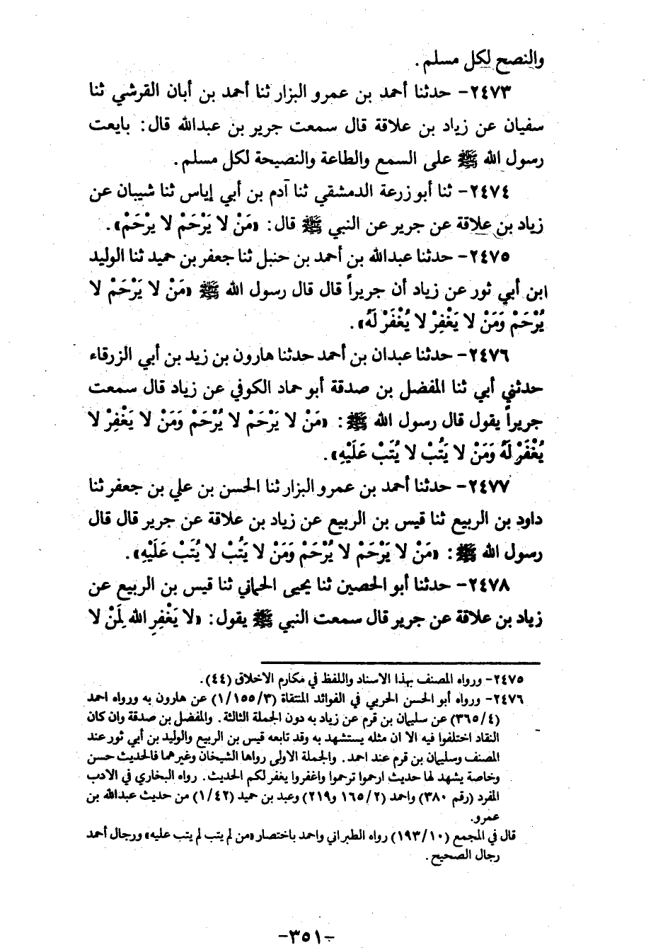 2478 - حَدَّثَنَا أَبُو الْحُصَيْنِ، ثنا يَحْيَى الْحِمَّانِيُّ، ثنا قَيْسُ بْنُ الرَّبِيعِ، عَنْ زِيَادِ بْنِ عِلَاقَةَ، عَنْ جَرِيرٍ، قَالَ: سَمِعْتُ النَّبِيَّ صَلَّى اللهُ عَلَيْهِ وَسَلَّمَ يَقُولُ: «§لَا يَغْفِرُ اللهُ لِمَنْ لَا يَغْفِرُ، وَلَا يَرْحَمُ اللهُ مَنْ لَا يَرْحَمُ»