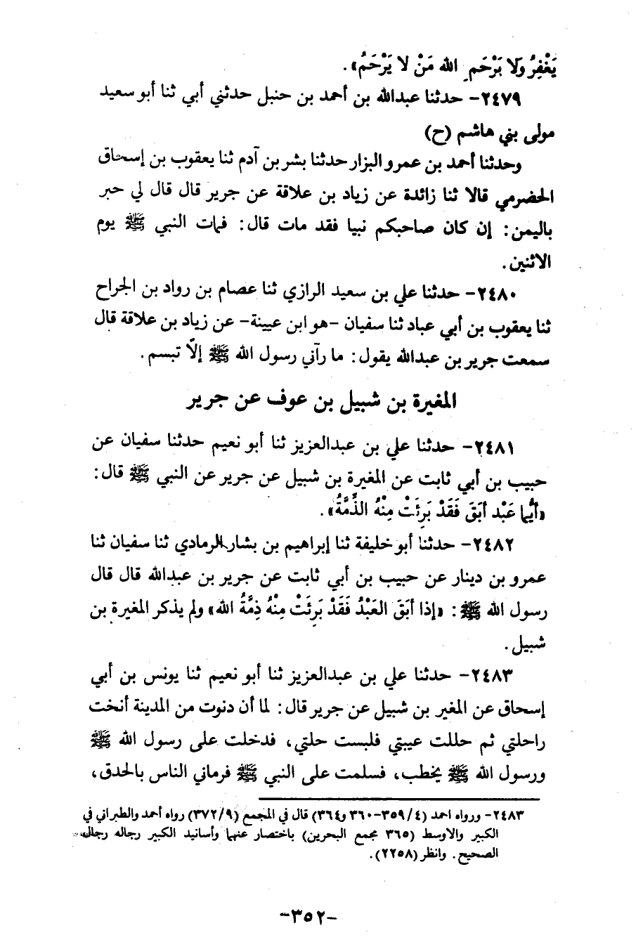 2479 - حَدَّثَنَا عَبْدُ اللهِ بْنُ أَحْمَدَ بْنِ حَنْبَلٍ، حَدَّثَنِي أَبِي، ثنا أَبُو سَعِيدٍ مَوْلَى بَنِي هَاشِمٍ، ح وَحَدَّثَنَا أَحْمَدُ بْنُ عَمْرٍو الْبَزَّارُ، حَدَّثَنَا بِشْرُ بْنُ آدَمَ، ثنا يَعْقُوبُ بْنُ إِسْحَاقَ الْحَضْرَمِيُّ، قَالَا: ثنا زَائِدَةُ، عَنْ زِيَادِ بْنِ عِلَاقَةَ، عَنْ جَرِيرٍ، قَالَ: قَالَ لِي حَبْرٌ بِالْيَمَنِ: إِنْ كَانَ صَاحِبُكُمْ نَبِيًّا، فَقَدْ مَاتَ، قَالَ: «§فَمَاتَ النَّبِيُّ صَلَّى اللهُ عَلَيْهِ وَسَلَّمَ يَوْمَ الِاثْنَيْنِ»
