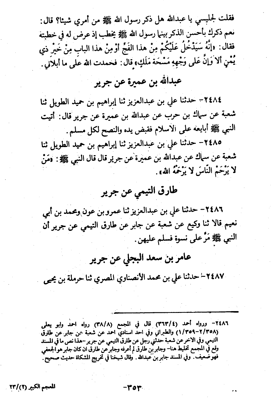 2486 - حَدَّثَنَا عَلِيُّ بْنُ عَبْدِ الْعَزِيزِ، ثنا عَمْرُو بْنُ عَوْنٍ، وَمُحَمَّدُ بْنُ أَبِي نُعَيْمٍ، قَالَا: ثنا وَكِيعٌ، عَنْ شُعْبَةَ، عَنْ جَابِرٍ، عَنْ طَارِقٍ التَّيْمِيِّ، عَنْ جَرِيرٍ: «أَنَّ النَّبِيَّ صَلَّى اللهُ عَلَيْهِ وَسَلَّمَ §مَرَّ عَلَى نِسْوَةٍ فَسَلَّمَ عَلَيْهِنَّ»