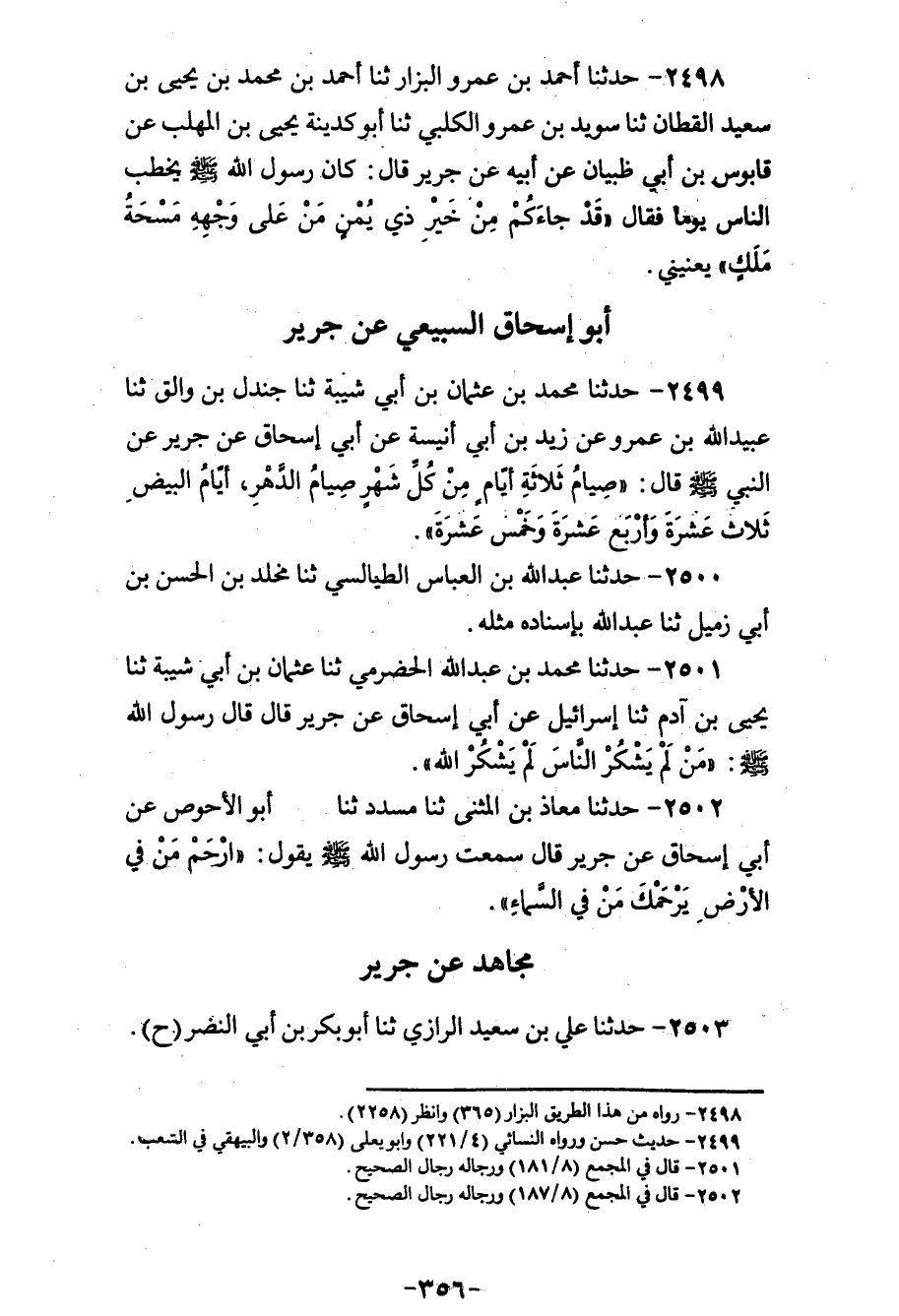 2501 - حَدَّثَنَا مُحَمَّدُ بْنُ عَبْدِ اللهِ الْحَضْرَمِيُّ، ثنا عُثْمَانُ بْنُ أَبِي شَيْبَةَ، ثنا يَحْيَى بْنُ آدَمَ، ثنا إِسْرَائِيلُ، عَنْ أَبِي إِسْحَاقَ، عَنْ جَرِيرٍ، قَالَ: قَالَ رَسُولُ اللهِ صَلَّى اللهُ عَلَيْهِ وَسَلَّمَ: «§مَنْ لَمْ يَشْكُرِ النَّاسَ لَمْ يَشْكُرِ اللهَ»