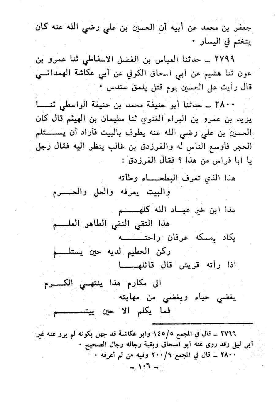 2812 - حَدَّثَنَا مُحَمَّدُ بْنُ عَلِيٍّ الصَّائِغُ، حَدَّثَنَا يَعْقُوبُ بْنُ حُمَيْدِ بْنِ كَاسِبٍ، ثنا سُفْيَانُ بْنُ حَمْزَةَ، عَنْ كَثِيرِ بْنِ زَيْدٍ، عَنِ الْمُطَّلِبِ بْنِ عَبْدِ اللهِ بْنِ حَنْطَبٍ، قَالَ: لَمَّا أُحِيطَ بِالْحُسَيْنِ بْنِ عَلِيٍّ، قَالَ: مَا اسْمُ هَذِهِ الْأَرْضِ؟ قِيلَ: كَرْبَلَاءُ. فَقَالَ: §صَدَقَ النَّبِيُّ صَلَّى اللهُ عَلَيْهِ وَسَلَّمَ: «إِنَّهَا أَرْضُ كَرْبٍ وَبَلَاءٍ»