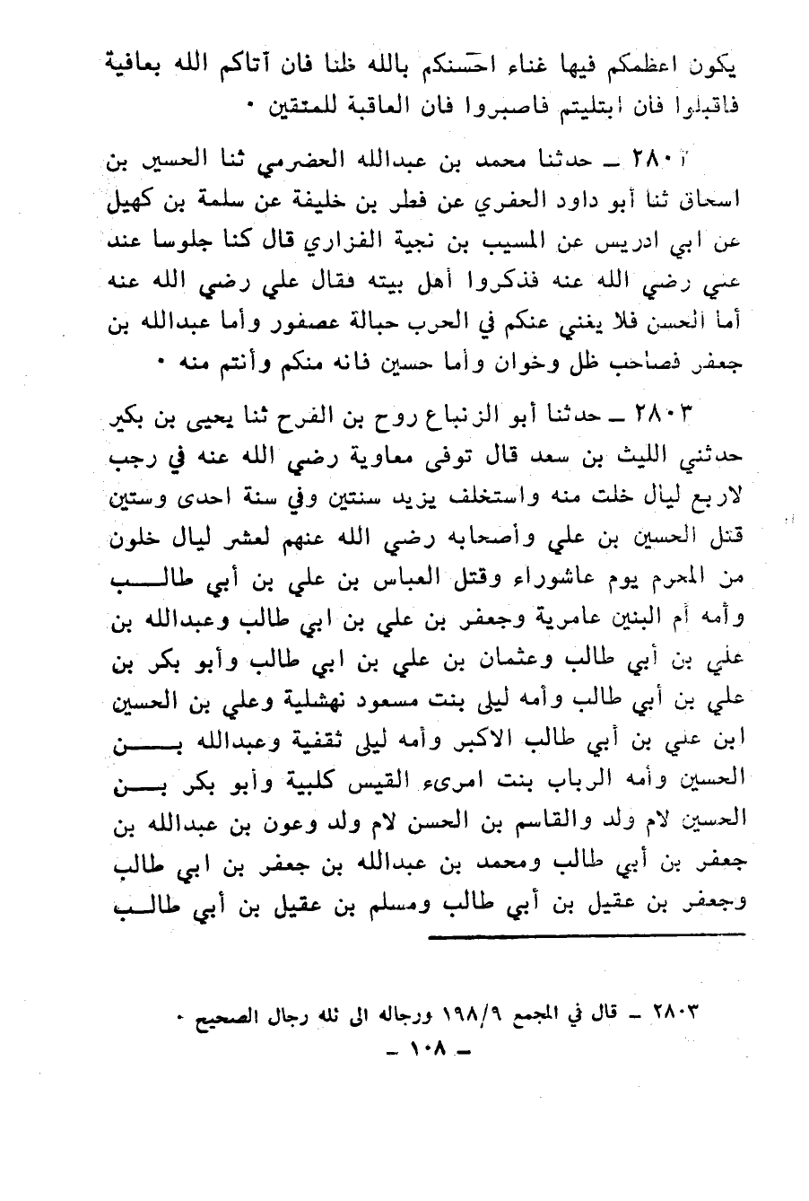 2819 - حَدَّثَنَا الْحُسَيْنُ بْنُ إِسْحَاقَ التُّسْتَرِيُّ، ثنا يَحْيَى بْنُ عَبْدِ الْحَمِيدِ الْحِمَّانِيُّ، ثنا سُلَيْمَانُ بْنُ بِلَالٍ، عَنْ كَثِيرِ بْنِ زَيْدٍ، عَنْ عَبْدِ الْمُطَّلِبِ بْنِ عَبْدِ اللهِ بْنِ حَنْطَبٍ، عَنْ أُمِّ سَلَمَةَ، قَالَتْ: كَانَ رَسُولُ اللهِ صَلَّى اللهُ عَلَيْهِ وَسَلَّمَ جَالِسًا ذَاتَ يَوْمٍ فِي بَيْتِي، فَقَالَ: «لَا يَدْخُلْ عَلَيَّ أَحَدٌ» . فَانْتَظَرْتُ فَدَخَلَ الْحُسَيْنُ رَضِيَ اللهُ عَنْهُ، فَسَمِعْتُ نَشِيجَ رَسُولِ اللهِ صَلَّى اللهُ عَلَيْهِ وَسَلَّمَ يَبْكِي، فَاطَّلَعْتُ فَإِذَا حُسَيْنٌ فِي حِجْرِهِ، وَالنَّبِيُّ صَلَّى اللهُ عَلَيْهِ وَسَلَّمَ يَمْسَحُ جَبِينَهُ وَهُوَ يَبْكِي، فَقُلْتُ: وَاللهِ مَا عَلِمْتُ حِينَ دَخَلَ، فَقَالَ: " إِنَّ §جِبْرِيلَ عَلَيْهِ السَّلَامُ كَانَ مَعَنَا فِي الْبَيْتِ، فَقَالَ: تُحِبُّهُ؟ قُلْتُ: أَمَّا مِنَ الدُّنْيَا فَنَعَمْ. قَالَ: إِنَّ أُمَّتَكَ سَتَقْتُلُ هَذَا بِأَرْضٍ يُقَالُ لَهَا كَرْبَلَاءُ ". فَتَنَاوَلَ جِبْرِيلُ عَلَيْهِ السَّلَامُ مِنْ تُرْبَتِهَا، فَأَرَاهَا النَّبِيَّ صَلَّى اللهُ عَلَيْهِ وَسَلَّمَ، فَلَمَّا أُحِيطَ بِحُسَينٍ حِينَ قُتِلَ، قَالَ: مَا اسْمُ هَذِهِ الْأَرْضِ؟ قَالُوا: كَرْبَلَاءُ. قَالَ: صَدَقَ اللهُ وَرَسُولُهُ، أَرْضُ كَرْبٍ وَبَلَاءٍ