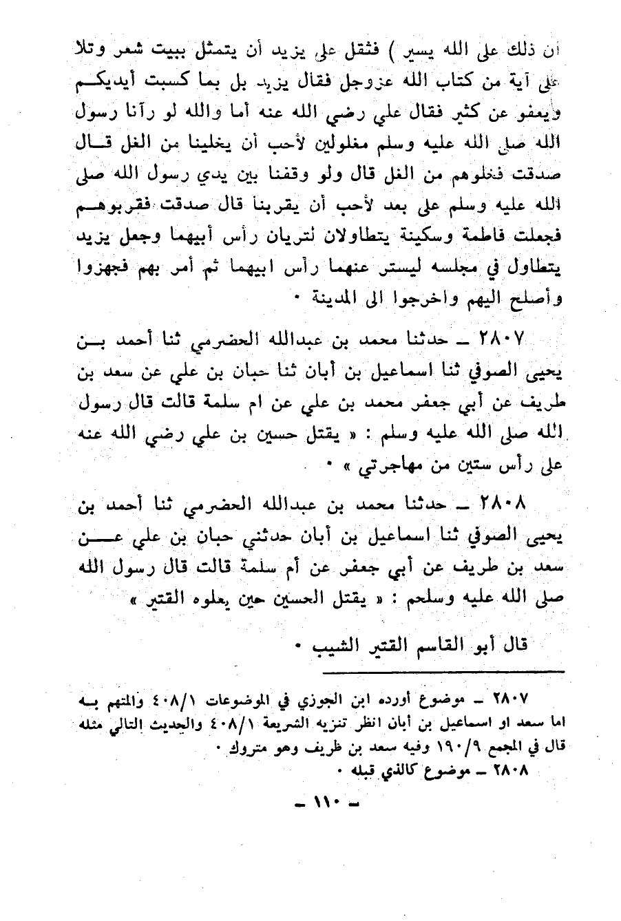 2824 - حَدَّثَنَا مُحَمَّدُ بْنُ عَبْدِ اللهِ الْحَضْرَمِيُّ، ثنا عَبْدُ اللهِ بْنُ الْحَكَمِ بْنِ أَبِي زِيَادٍ، وَأَحْمَدُ بْنُ يَحْيَى الصُّوفِيُّ، قَالَا: ثنا عُبَيْدُ اللهِ بْنُ مُوسَى، عَنْ إِسْرَائِيلَ، عَنْ أَبِي إِسْحَاقَ، عَنْ هَانِي بْنِ هَانِي، عَنْ عَلِيٍّ رَضِي اللهُ عَنْهُ قَالَ: «§لَيُقْتَلَنَّ الْحُسَيْنُ قَتْلًا، وَإِنِّي لَأَعْرِفُ التُّرْبَةَ الَّتِي يُقْتَلُ فِيهَا قَرِيبًا مِنَ النَّهْرَيْنِ»