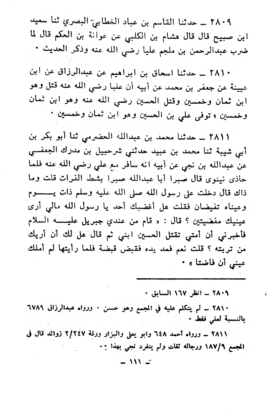 2825 - حَدَّثَنَا مُحَمَّدُ بْنُ عَبْدِ اللهِ الْحَضْرَمِيُّ، حَدَّثَنَا عُثْمَانُ بْنُ أَبِي شَيْبَةَ، ثنا أَبُو الْأَعْمَشِ، عَنْ سَلَّامٍ أَبِي شُرَحْبِيلَ، عَنْ أَبِي هَرْثَمَةَ، قَالَ: كُنْتُ مَعَ عَلِيٍّ رَضِيَ اللهُ عَنْهُ بِنَهْرَيْ كَرْبَلَاءَ، فَمَرَّ بِشَجَرَةٍ تَحْتَهَا بَعْرُ غِزْلَانٍ، فَأَخَذَ مِنْهُ قَبْضَةً فَشَمَّهَا، ثُمَّ قَالَ: «§يُحْشَرُ مِنْ هَذَا الظَّهْرِ سَبْعُونَ أَلْفًا يَدْخُلُونَ الْجَنَّةَ بِغَيْرِ حِسَابٍ»