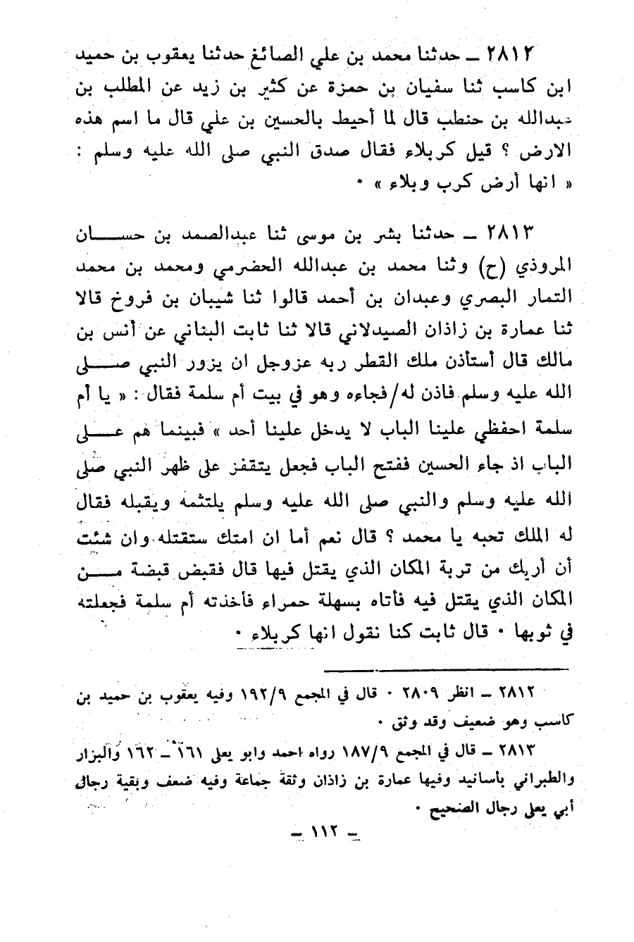 2829 - حَدَّثَنَا مُحَمَّدُ بْنُ عَبْدِ اللهِ الْحَضْرَمِيُّ، ثنا عُثْمَانُ بْنُ أَبِي شَيْبَةَ، ثنا سَعِيدُ بْنُ خُثَيْمٍ، عَنْ مُحَمَّدِ بْنِ خَالِدٍ الضَّبِّيِّ، عَنْ إِبْرَاهِيمَ، قَالَ: «§لَوْ كُنْتُ فِيمَنْ قَتَلَ الْحُسَيْنَ بْنَ عَلِيٍّ، ثُمَّ غُفِرَ لِي، ثُمَّ أُدْخِلْتُ الْجَنَّةَ، اسْتَحْيَيْتُ أَنْ أَمُرَّ عَلَى النَّبِيِّ صَلَّى اللهُ عَلَيْهِ وَسَلَّمَ، فَيَنْظُرَ فِي وَجْهِي»