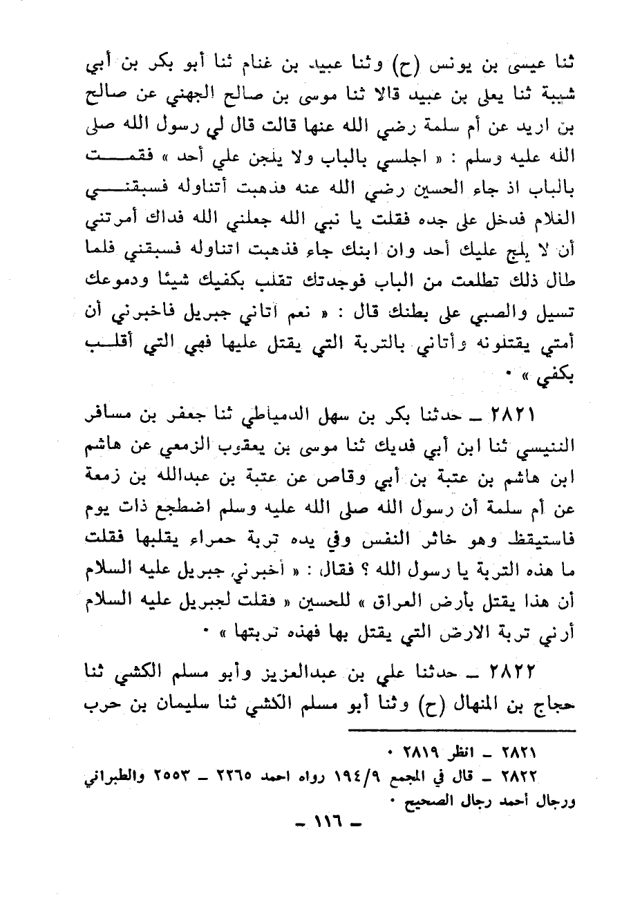 2847 - حَدَّثَنَا عَلِيُّ بْنُ عَبْدِ الْعَزِيزِ، ثنا أَبُو نُعَيْمٍ، ثنا عَبْدُ السَّلَامِ بْنُ حَرْبٍ، عَنْ يَزِيدَ بْنِ أَبِي زِيَادٍ، قَالَ: خَرَجَ النَّبِيُّ صَلَّى اللهُ عَلَيْهِ وَسَلَّمَ مِنْ بَيْتِ عَائِشَةَ رَضِي اللهُ عَنْهَا، فَمَرَّ عَلَى بَيْتِ فَاطِمَةَ، §فَسَمِعَ حُسَيْنًا يَبْكِي رَضِيَ اللهُ عَنْهُ، فَقَالَ: «أَلَمْ تَعْلَمِي أَنَّ بُكاءَهُ يُؤْذِينِي؟»
