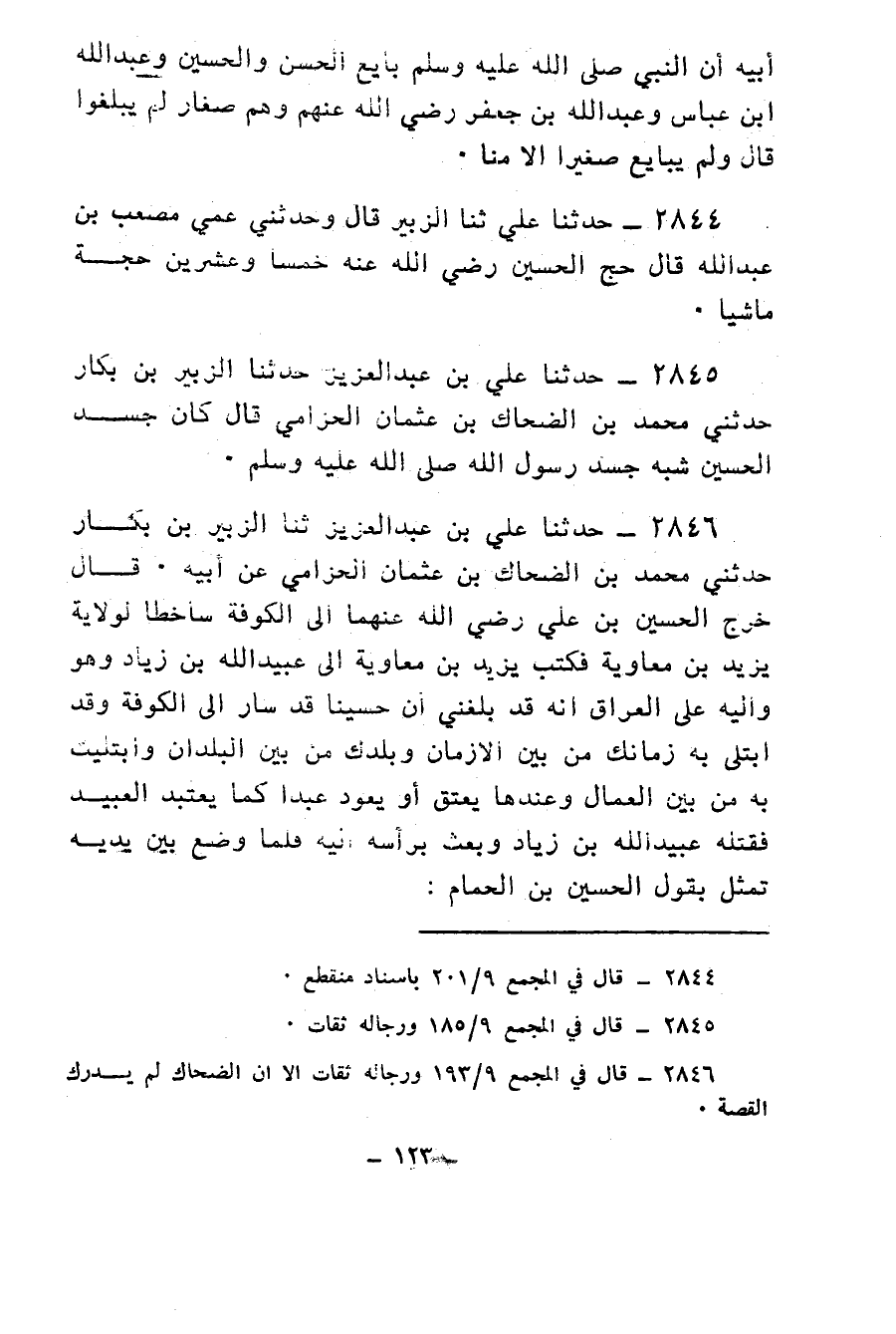 2873 - حَدَّثَنَا زَكَرِيَّا بْنُ يَحْيَى السَّاجِيُّ، ثنا مُحَمَّدُ بْنُ عَبْدِ الرَّحْمَنِ بْنِ صَالِحٍ الْأَسَدِيُّ، ثنا السَّرِيُّ بْنُ مَنْصُورِ بْنِ عَمَّارٍ، عَنْ أَبِيهِ، عَنِ ابْنِ لَهِيعَةَ، عَنْ أَبِي قَبِيلٍ، قَالَ: " §لَمَّا قُتِلَ الْحُسَيْنُ بْنُ عَلِيٍّ رَضِيَ اللهُ تَعَالَى عَنْهُمَا، احْتَزُّوا رَأْسَهُ، وَقَعَدُوا فِي أَوَّلِ مَرْحَلَةٍ يَشْرَبُونَ النَّبِيذَ يَتَحَيَّوْنَ بِالرَّأْسِ، فَخَرَجَ عَلَيْهِمْ قَلَمٌ مِنْ حَدِيدٍ مِنْ حَائِطٍ، فَكَتَبَ بِسَطْرِ دَمٍ: