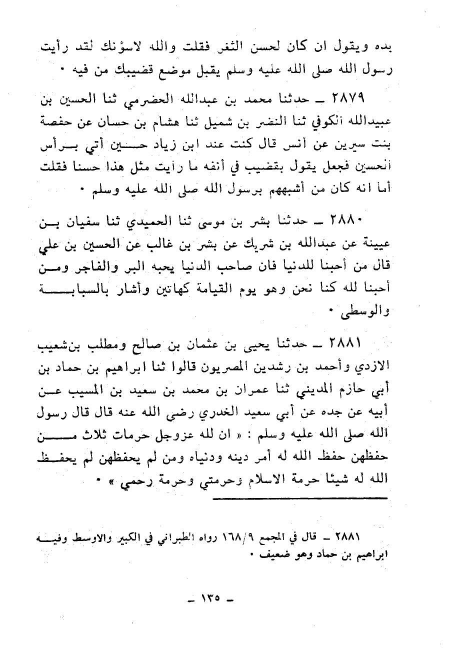 2911 - حَدَّثَنَا أَحْمَدُ بْنُ عَمْرٍو الْقَطِرَانِيُّ، ثنا زِيَادُ بْنُ يَحْيَى، ثنا أَبُو عَتَّابٍ الدَّلَّالُ، أَنَا عَمْرُو بْنُ ثَابِتٍ، حَدَّثَنِي حَبِيبُ بْنُ أَبِي ثَابِتٍ، قَالَ: صَنَعَتِ امْرَأَةٌ مِنْ نِسَاءِ الْحُسَيْنِ طَعَامًا فِي بَعْضِ أَرْضِهِ، فَطَعِمَ ثُمَّ رُفِعَ الطَّعَامُ، فَجَاءَ مَوْلًى لَهُ، فَدَعَا بِالطَّعَامِ، فَقَالَ: يَا أَبَا عَبْدِ اللهِ لَا أُرِيدُهُ. قَالَ: لِمَ؟ قَالَ: أَكَلْنَا قُبَيْلُ عِنْدَ عُبَيْدِ اللهِ بْنِ عَبَّاسٍ، فَقَالَ الْحُسَيْنُ: إِنَّ أَبَاهَ كَانَ سَيِّدَ قُرَيْشٍ، إِنَّ رَسُولَ اللهِ صَلَّى اللهُ عَلَيْهِ وَسَلَّمَ قَالَ: «§يَا بَنِي عَبْدِ الْمُطَّلِبِ أَطْعِمُوا الطَّعَامَ، وَأَطِيبُوا الْكَلَامَ»