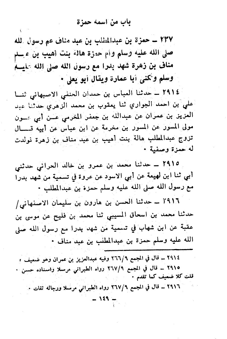 2953 - حَدَّثَنَا مُحَمَّدُ بْنُ عَبْدِ اللهِ الْحَضْرَمِيُّ، ثنا أَبُو كُرَيْبٍ، ثنا أَبُو أُسَامَةَ، عَنِ ابْنِ عَوْنٍ، عَنْ عُمَيْرِ بْنِ إِسْحَاقَ، قَالَ: §كَانَ حَمْزَةُ بْنُ عَبْدِ الْمُطَّلِبِ يُقَاتِلُ بَيْنَ يَدَيْ رَسُولِ اللهِ صَلَّى اللهُ عَلَيْهِ وَسَلَّمَ بِسَيفَيْنِ، وَيَقُولُ: «أَنَا أَسَدُ اللهِ وَأَسَدُ رَسُولِهِ»