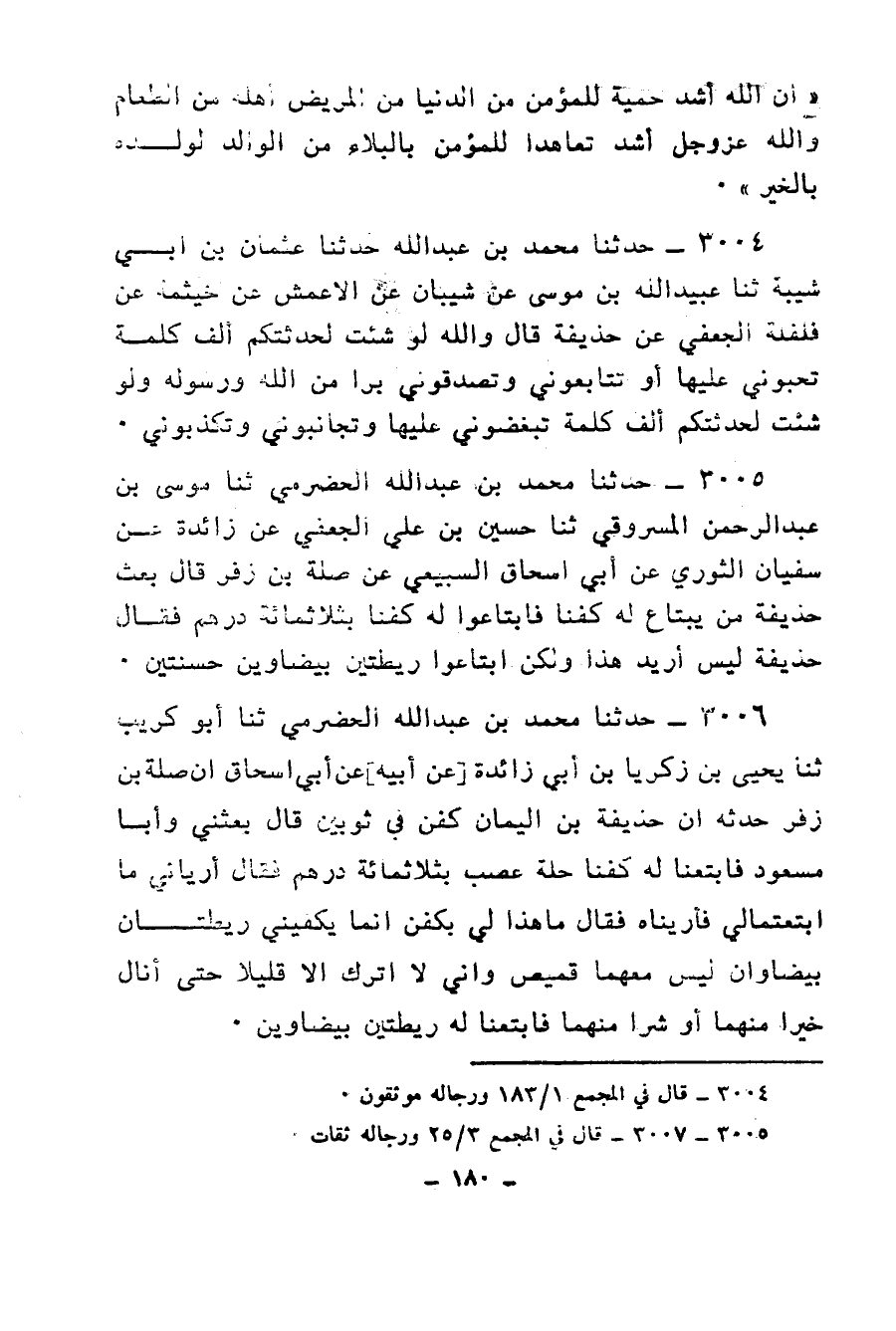 3052 - حَدَّثَنَا مُحَمَّدُ بْنُ عَبْدِ اللهِ الْحَضْرَمِيُّ وَزَكَرِيَّا بْنُ يَحْيَى السَّاجيُّ، قَالَا: ثنا نَصْرُ بْنُ عَبْدِ الرَّحْمَنِ الْوَشَّاءُ، ح وَحَدَّثَنَا أَحْمَدُ بْنُ الْقَاسِمِ بْنِ مُسَاوِرٍ الْجَوْهَرِيُّ، ثنا سَعِيدُ بْنُ سُلَيْمَانَ الْوَاسِطِيُّ، قَالَا: ثنا زَيْدُ بْنُ الْحَسَنِ الْأَنْمَاطِيُّ، ثنا مَعْرُوفُ بْنُ خَرَّبُوذَ، عَنْ أَبِي الطُّفَيْلِ، عَنْ حُذَيْفَةَ بْنِ أَسِيدٍ الْغِفَارِيِّ، قَالَ: لَمَّا صَدَرَ رَسُولُ اللهِ صَلَّى اللهُ عَلَيْهِ وَسَلَّمَ مِنْ حَجَّةِ الْوَدَاعِ نَهَى أَصْحَابَهُ عَنْ شَجَرَاتٍ بِالْبَطْحَاءِ مُتَقَارِبَاتٍ أَنْ يَنْزِلُوا تَحْتَهُنَّ، ثُمَّ بَعَثَ إِلَيْهِنَّ فَقُمَّ مَا تَحْتَهُنَّ مِنَ الشَّوْكِ، وَعَمَدَ إِلَيْهِنَّ فَصَلَّى تَحْتَهُنَّ، ثُمَّ قَامَ فَقَالَ: «يَا أَيُّهَا النَّاسُ، إِنِّي قَدْ نَبَّأَنِيَ اللَّطِيفُ الْخَبِيرُ أَنَّهُ §لَمْ يُعَمَّرْ نَبِيٌّ إِلَّا نِصْفَ عُمْرِ الَّذِي يَلِيهِ مِنْ قَبْلِهِ، وَإِنِّي لَأَظُنُّ أَنِّي يُوشِكُ أَنْ أُدْعَى فَأُجِيبَ، وَإِنِّي مَسْئُولٌ، وَإِنَّكُمْ مَسْئُولونَ، فَمَاذَا أَنْتُمْ قَائِلُونَ؟» قَالُوا: نَشْهَدُ أَنَّكَ قَدْ بَلَّغْتَ وَجَاهَدْتَ وَنَصَحْتَ، فَجَزَاكَ اللهُ خَيْرًا