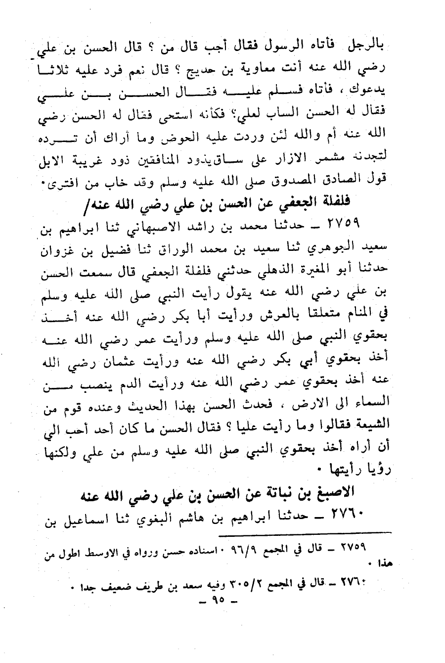 2769 - حَدَّثَنَا مُحَمَّدُ بْنُ عَبْدِ اللهِ الْحَضْرَمِيُّ، قَالَ: وَجَدْتُ فِي كِتَابِ عُقْبَةَ بْنِ قَبِيصَةَ: حَدَّثَنَا أَبِي، عَنْ حَمْزَةَ الزَّيَّاتِ، عَنْ أَبِي إِسْحَاقَ، عَنْ هُبَيْرَةَ بْنِ يَرِيمَ، عَنْ عَلِيٍّ، قَالَ: «§مَنْ أَرَادَ أَنْ يَنْظُرَ إِلَى وَجْهِ رَسُولِ اللهِ صَلَّى اللهُ عَلَيْهِ وَسَلَّمَ مِنْ رَأْسَهِ إِلَى عُنُقِهِ فَلْيَنْظُرْ إِلَى الْحَسَنِ، وَمَنْ أَرَادَ أَنْ يَنْظُرَ إِلَى مَا لَدُنْ عُنُقِهِ فَلْيَنْظُرْ إِلَى الْحُسَيْنِ، اقْتَسَمَاهُ»