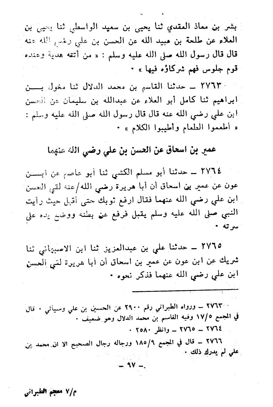 2777 - حَدَّثَنَا مُحَمَّدُ بْنُ عَبْدِ اللهِ الْحَضْرَمِيُّ، ثنا عَبْدُ اللهِ بْنُ عُمَرَ بْنِ أَبَانَ، ثنا يَحْيَى بْنُ عِيسَى الرَّمْلِيُّ التَّمِيمِيُّ، ثنا الْأَعْمَشُ، عَنْ سَالِمِ بْنِ أَبِي الْجَعْدِ، قَالَ: قَالَ عَلِيٌّ رَضِيَ اللهُ عَنْهُ: كُنْتُ رَجُلًا أُحِبُّ الْحَرْبَ، فَلَمَّا وُلِدَ الْحَسَنُ هَمَمْتُ أَنْ أُسَمِّيَهُ حَرْبًا، فَسَمَّاهُ رَسُولُ اللهِ صَلَّى اللهُ عَلَيْهِ وَسَلَّمَ الْحَسَنَ، فَلَمَّا وُلِدَ الْحُسَيْنُ هَمَمْتُ أَنْ أُسَمِّيَهُ حَرْبًا، فَسَمَّاهُ رَسُولُ اللهِ صَلَّى اللهُ عَلَيْهِ وَسَلَّمَ الْحُسَيْنَ، وَقَالَ صَلَّى اللهُ عَلَيْهِ وَسَلَّمَ: «إِنِّي §سَمَّيْتُ ابْنَيَّ هَذَيْنِ بِاسْمِ ابْنَيْ هَارُونَ شَبَرَ وَشُبَيْرَ»