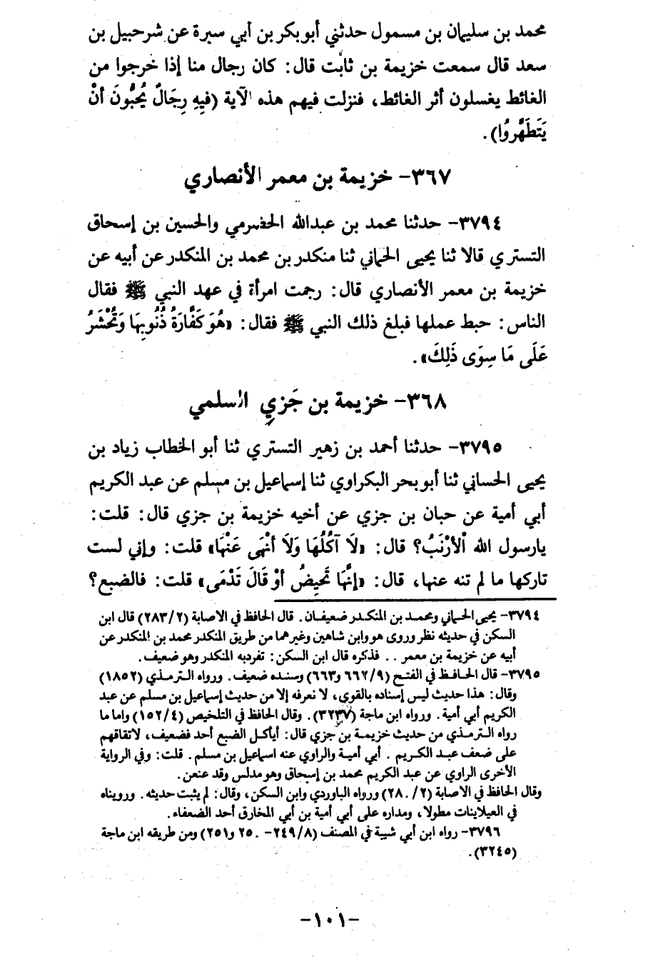 3795 - حَدَّثَنَا أَحْمَدُ بْنُ زُهَيْرٍ التُّسْتَرِيُّ، ثنا أَبُو الْخَطَّابِ زِيَادُ بْنُ يَحْيَى الْحَسَّانِيُّ، ثنا أَبُو بَحْرٍ الْبَكْرَاوِيُّ، ثنا إِسْمَاعِيلُ بْنُ مُسْلِمٍ، عَنْ عَبْدِ الْكَرِيمِ أَبِي أُمَيَّةَ، عَنْ حِبَّانَ بْنِ جُزَيٍّ، عَنْ أَخِيهِ خُزَيْمَةَ بْنِ جُزَيٍّ، قَالَ: قُلْتُ: يَا رَسُولَ اللهِ الْأَرْنَبُ؟ قَالَ: «§لَا آكُلُهَا وَلَا أَنْهَى عَنْهَا» ، قُلْتُ: وَإِنِّي لَسْتُ تَارِكَها مَا لَمْ تَنْهُ عَنْهَا، قَالَ: " إِنَّهَا تَحِيضُ - أَوْ قَالَ: تَدْمَى - "، قُلْتُ: فَالضَّبُعُ؟ قَالَ: «وَمَنْ يَأْكُلُ الضَّبُعَ؟»