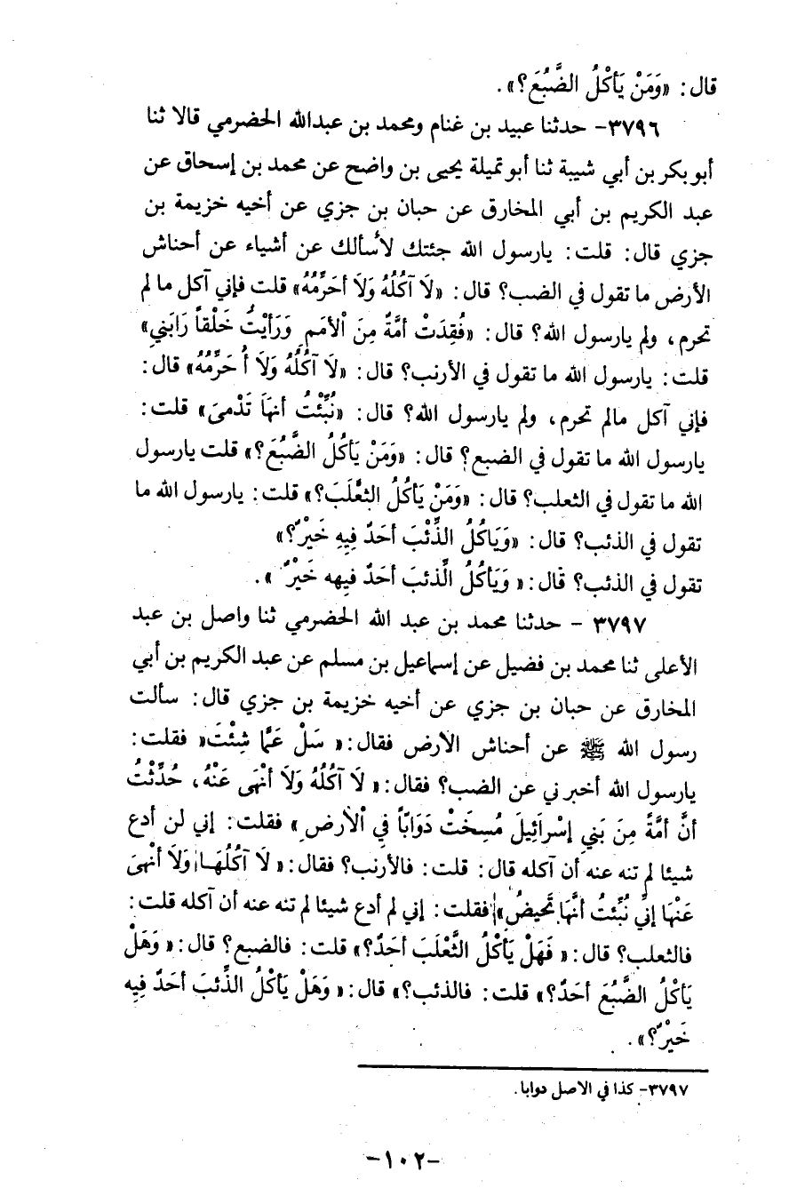 3797 - حَدَّثَنَا مُحَمَّدُ بْنُ عَبْدِ اللهِ الْحَضْرَمِيُّ، ثنا وَاصِلُ بْنُ عَبْدِ الْأَعْلَى، ثنا مُحَمَّدُ بْنُ فُضَيْلٍ، عَنْ إِسْمَاعِيلَ بْنِ مُسْلِمٍ، عَنْ عَبْدِ الْكَرِيمِ بْنِ أَبِي الْمُخَارِقِ، عَنْ حِبَّانَ بْنِ جُزَيٍّ،، عَنْ خُزَيْمَةَ بْنِ جُزَيٍّ، قَالَ: سَأَلْتُ رَسُولَ اللهِ صَلَّى اللهُ عَلَيْهِ وَسَلَّمَ، عَنْ أَحْنَاشِ الْأَرْضِ فَقَالَ: «سَلْ عَمَّا شِئْتَ» ، فَقُلْتُ: يَا رَسُولَ اللهِ، أَخْبِرْنِي عَنِ الضَّبِّ؟ فَقَالَ: «§لَا آكُلُهُ وَلَا أَنْهَى عَنْهُ، حُدِّثْتُ أَنَّ أُمَّةً مِنْ بَنِي إِسْرَائِيلَ مُسِخَتْ دَوَابَّ فِي الْأَرْضِ» ، فَقُلْتُ: إِنِّي لَنْ أَدَعَ شَيْئًا لَمْ تَنْهُ عَنْهُ أَنْ آكُلَهُ، قَالَ: قُلْتُ فَالْأَرْنَبُ؟ فَقَالَ: «لَا آكُلُهَا وَلَا أَنْهَى عَنْهَا إِنِّي نُبِّئْتُ أَنَّهَا تَحِيضُ» ، فَقُلْتُ: إِنِّي لَمْ أَدَعْ شَيْئًا لَمْ تَنْهُ عَنْهُ أَنْ آكُلُهُ قُلْتُ: فَالثَّعْلَبُ؟ قَالَ: «فَهَلْ يَأْكُلُ الثَّعْلَبَ أَحَدٌ؟» ، قُلْتُ: فَالضَّبُعُ؟، قَالَ: «وَهَلْ يَأْكُلُ الضَّبُعَ أَحَدٌ؟» ، قُلْتُ: فَالذِّئْبُ؟، قَالَ: «وَهَلْ يَأْكُلُ الذِّئْبَ أَحَدٌ فِيهِ خَيْرٌ؟»