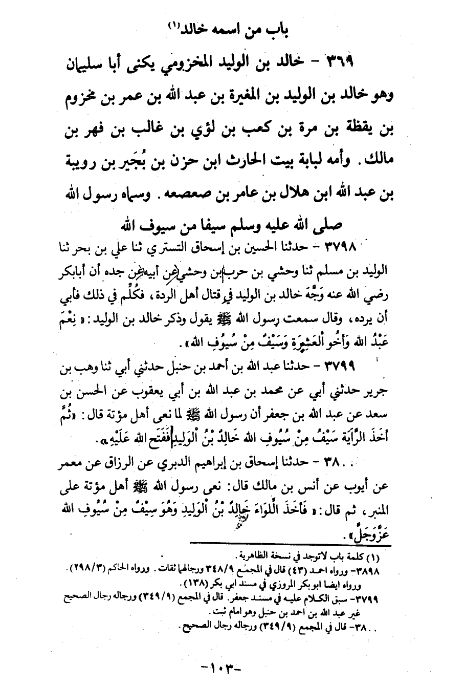 §خَالِدُ بْنُ الْوَلِيدِ الْمَخْزُومِيُّ «يُكْنَى أَبَا سُلَيْمَانَ وَهُوَ خَالِدُ بْنُ الْوَلِيدِ بْنِ الْمُغِيرَةِ بْنِ عَبْدِ اللهِ بْنِ عُمَرَ بْنِ مَخْزُومِ بْنِ يَقَظَةَ بْنِ مُرَّةَ بْنِ كَعْبِ بْنِ لُؤَيِّ بْنِ غَالِبِ بْنِ فِهْرِ بْنِ مَالِكٍ وَأُمِّهِ لُبَابَةَ بِنْتِ الْحَارِثِ بْنِ حَزْنِ بْنِ بُجَيْرِ بْنِ رُوَيْبَةَ بْنِ عَبْدِ اللهِ بْنِ هِلَالِ بْنِ عَامِرِ بْنِ صَعْصَعَةَ وَسَمَّاهُ رَسُولُ اللهِ صَلَّى اللهُ عَلَيْهِ وَسَلَّمَ سَيْفًا مِنْ سُيُوفِ اللهِ»