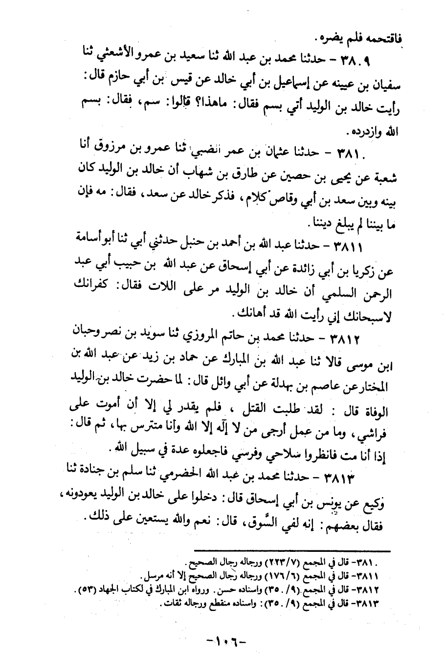 3812 - حَدَّثَنَا مُحَمَّدُ بْنُ حَاتِمٍ الْمَرْوَزِيُّ، ثنا سُوَيْدُ بْنُ نَصْرٍ، وَحِبَّانُ بْنُ مُوسَى، قَالَا: ثنا عَبْدُ اللهِ بْنُ الْمُبَارَكِ، عَنْ حَمَّادِ بْنِ زَيْدٍ، عَنْ عَبْدِ اللهِ بْنِ الْمُخْتَارِ، عَنْ عَاصِمِ ابْنِ بَهْدَلَةَ، عَنْ أَبِي وَائِلٍ، قَالَ: لَمَّا حَضَرَتْ خَالِدَ بْنَ الْوَلِيدِ الْوَفَاةُ، قَالَ: «§لَقَدْ طَلَبْتُ الْقَتْلَ فَلَمْ يُقَدَّرْ لِي إِلَّا أَنْ أَمُوتَ عَلَى فِرَاشِي، وَمَا مِنْ عَمِلٍ أَرْجَى مِنْ لَا إِلَهَ إِلَّا اللهُ وَأَنَا مُتَتَرِّسٌ بِهَا» ، ثُمَّ قَالَ: «إِذَا أَنَا مُتُّ فَانْظُرُوا سِلَاحِي، وفَرَسِي فَاجْعَلُوهُ عِدَّةً فِي سَبِيلِ اللهِ»