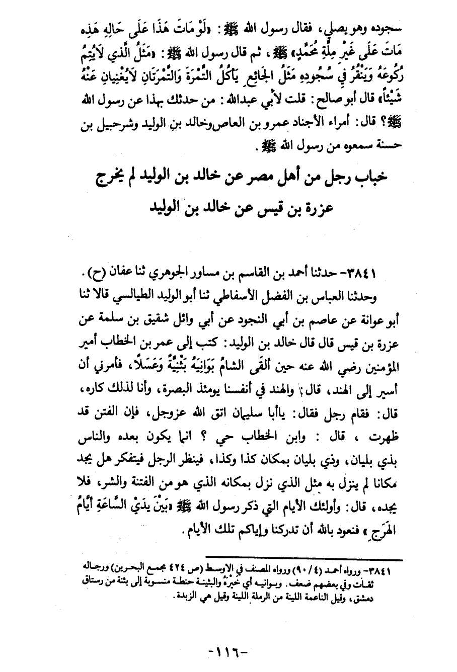3841 - حَدَّثَنَا أَحْمَدُ بْنُ الْقَاسِمِ بْنِ مُسَاوِرٍ الْجَوْهَرِيُّ، ثنا عَفَّانُ ح، وَحَدَّثَنَا الْعَبَّاسُ بْنُ الْفَضْلِ الْأَسْفَاطِيُّ، ثنا أَبُو الْوَلِيدِ الطَّيَالِسِيُّ، قَالَا: ثنا أَبُو عَوَانَةَ، عَنْ عَاصِمِ بْنِ أَبِي النَّجُودِ، عَنْ أَبِي وَائِلٍ شَقِيقِ بْنِ سَلَمَةَ، عَنْ عَزْرَةَ بْنِ قَيْسٍ، قَالَ: قَالَ خَالِدُ بْنُ الْوَلِيدِ كَتَبَ إِلَى عُمَرَ بْنِ الْخَطَّابِ أَمِيرِ الْمُؤْمِنِينَ رَضِيَ اللهُ عَنْهُ، حِينَ أَلْقَى الشَّامُ بَوَانِيَهُ بِثَنِيَّةً وَعَسَلًا، فَأَمَرَنِي أَنْ أَسِيرَ إِلَى الْهِنْدِ، قَالَ: وَالْهِنْدُ فِي أَنْفُسِنَا يَوْمَئِذٍ الْبَصْرَةُ، وَأَنَا لِذَلِكَ كَارِهٌ، قَالَ: فَقَامَ رَجُلٌ فَقَالَ: يَا أَبَا سُلَيْمَانَ اتَّقِ اللهَ عَزَّ وَجَلَّ، فَإِنَّ الْفِتَنَ قَدْ ظَهَرَتْ، قَالَ: وَابْنُ الْخَطَّابِ حَيٌّ؟ إِنَّمَا يَكُونُ بَعْدَهُ وَالنَّاسُ بِذِي بِلِّيَانَ، وَذِي بِلِّيَانَ بِمَكَانِ كَذَا وَكَذَا، فَيَنْظُرُ الرَّجُلُ فَيَتَفَكَّرُ هَلْ يَجِدُ مَكَانًا لَمْ يَنْزِلْ بِهِ مِثْلَ الَّذِي نَزَلَ بِمَكَانِهِ الَّذِي هُوَ مِنَ الْفِتْنَةِ وَالشَّرِّ، فَلَا يَجِدُهُ، قَالَ: وَأُولَئِكَ الْأَيَّامُ الَّتِي ذَكَرَ رَسُولُ اللهِ صَلَّى اللهُ عَلَيْهِ وَسَلَّمَ: «§بَيْنَ يَدَيِ السَّاعَةِ أَيَّامُ الْهَرْجِ» فَنَعُوذُ بِاللهِ أَنْ تَدْرِكَنَا وَإِيَّاكُمْ تِلْكَ الْأَيَّامُ