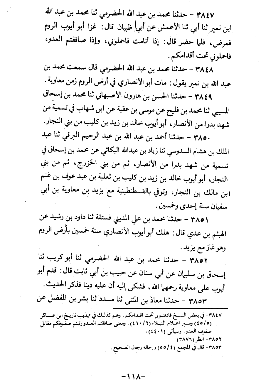 3847 - حَدَّثَنَا مُحَمَّدُ بْنُ عَبْدِ اللهِ الْحَضْرَمِيُّ، ثنا مُحَمَّدُ بْنُ عَبْدِ اللهِ بْنِ نُمَيْرٍ، ثنا أَبِي، ثنا الْأَعْمَشُ، عَنْ أَبِي ظَبْيَانَ، قَالَ: غَزَا أَبُو أَيُّوبَ الرُّومَ فَمَرِضَ، فَلَمَّا حَضَرَ قَالَ: «§إِذَا أَنَا مُتُّ فَاحْمِلُونِي، وَإِذَا صَافَفْتُمُ الْعَدُوَّ فَاحْمِلُونِي تَحْتَ أَقْدَامِكُمْ»