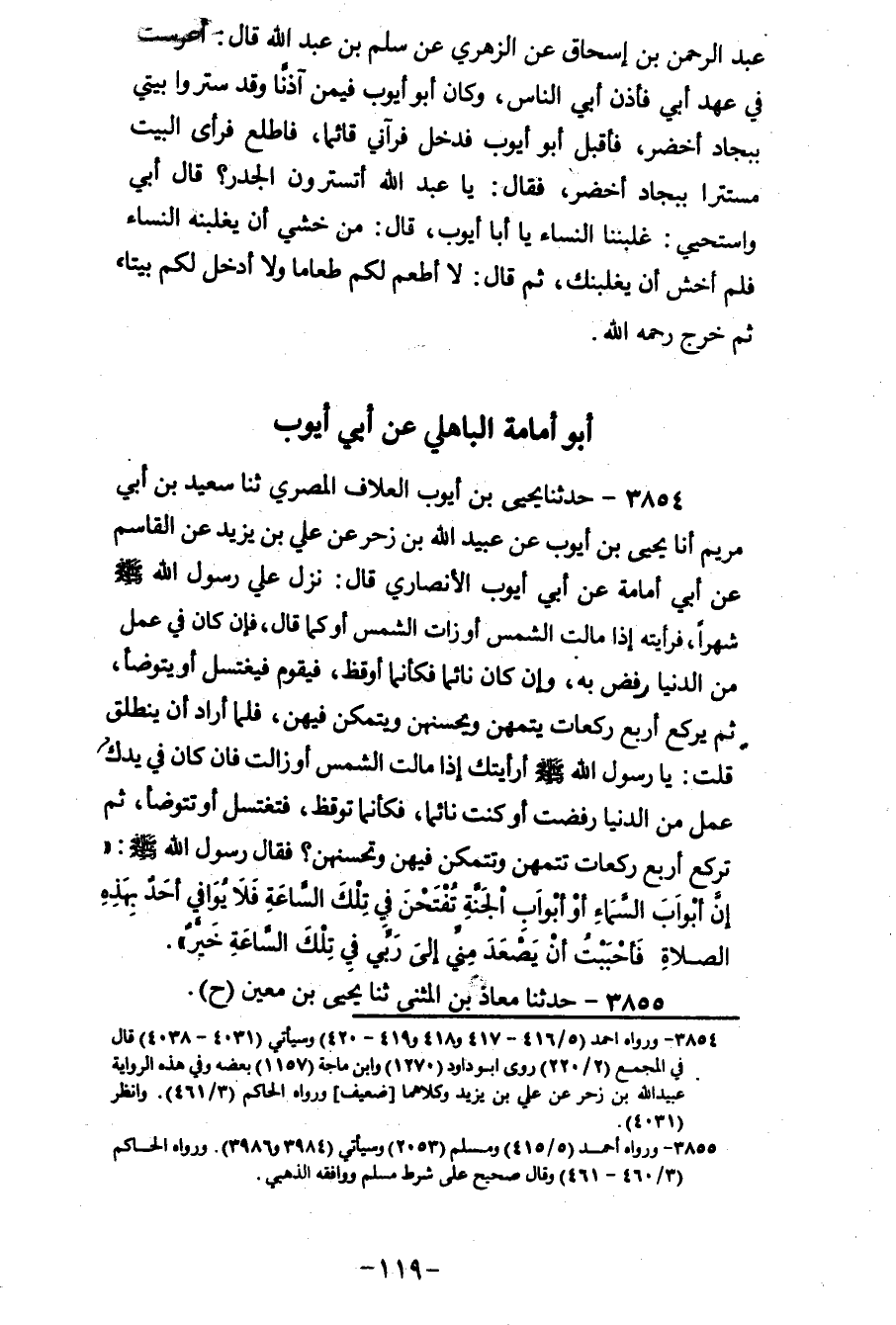 3854 - حَدَّثَنَا يَحْيَى بْنُ أَيُّوبَ الْعَلَّافُ الْمِصْرِيُّ، ثنا سَعِيدُ بْنُ أَبِي مَرْيَمَ، أَنَا يَحْيَى بْنُ أَيُّوبَ، عَنْ عُبَيْدِ اللهِ بْنِ زَحْرَ، عَنْ عَلِيِّ بْنِ يَزِيدَ، عَنِ الْقَاسِمِ، عَنْ أَبِي أُمَامَةَ، عَنْ أَبِي أَيُّوبَ الْأَنْصَارِيِّ، قَالَ: نَزَلَ عَلَيَّ رَسُولُ اللهِ صَلَّى اللهُ عَلَيْهِ وَسَلَّمَ شَهْرًا، فَرَأَيْتُهُ إِذَا مَالَتِ الشَّمْسُ أَوْ زَالَتِ الشَّمْسُ أَوْ كَمَا قَالَ: فَإِنْ كَانَ فِي عَمِلٍ مِنَ الدُّنْيَا رَفَضَ بِهِ، وَإِنْ كَانَ نَائِمًا فَكَأَنَّمَا أُوقِظَ، فَيَقُومُ فَيَغْتَسِلُ أَوْ يَتَوَضَّأُ، ثُمَّ يَرْكَعُ أَرْبَعَ رَكَعَاتٍ يُتِمُّهُنَّ ويُحْسِنُهُنَّ ويَتَمَكَّنُ فِيهِنَّ، فَلَمَّا أَرَادَ أَنْ يَنْطَلِقَ، قُلْتُ: يَا رَسُولَ اللهِ صَلَّى اللهُ عَلَيْهِ وَسَلَّمَ أَرَأَيْتَكَ إِذَا مَالَتِ الشَّمْسُ أَوْ زَالَتْ فَإِنْ كَانَ فِي يَدِكَ عَمَلٌ مِنَ الدُّنْيَا رَفَضْتَ أَوْ كُنْتَ نَائِمًا فَكَأَنَّمَا تُوقَظُ، فَتَغْتَسِلُ أَوْ تَتَوَضَّأُ، ثُمَّ تَرْكَعُ أَرْبَعَ رَكَعَاتٍ تُتِمُهُّنَّ وتَتَمَكَّنُ فِيهِنَّ وتُحْسِنُهُنَّ؟، فَقَالَ رَسُولُ اللهِ صَلَّى اللهُ عَلَيْهِ وَسَلَّمَ: «إِنَّ §أَبْوَابَ السَّمَاءِ أَوْ أَبْوَابَ الْجَنَّةِ تُفْتَحْنَ فِي تِلْكَ السَّاعَةِ فَلَا يُوَافِي أَحَدٌ بِهَذِهِ الصَّلَاةِ فَأَحْبَبْتُ أَنْ يَصْعَدَ مِنِّي إِلَى رَبِّي فِي تِلْكَ السَّاعَةِ خَيْرٌ»