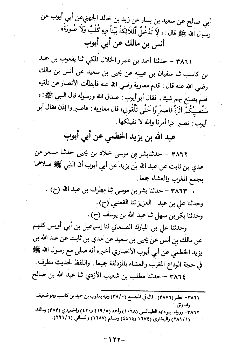 3862 - حَدَّثَنَا بِشْرُ بْنُ مُوسَى، عَنْ خَلَّادُ بْنُ يَحْيَى، حَدَّثَنَا مِسْعَرٌ، عَنْ عَدِيِّ بْنِ ثَابِتٍ، عَنْ عَبْدِ اللهِ بْنِ يَزِيدَ، عَنْ أَبِي أَيُّوبَ، أَنَّ النَّبِيَّ صَلَّى اللهُ عَلَيْهِ وَسَلَّمَ، «§صَلَّاهُمَا بِجَمْعٍ الْمَغْرِبَ وَالْعِشَاءَ جَمْعًا»