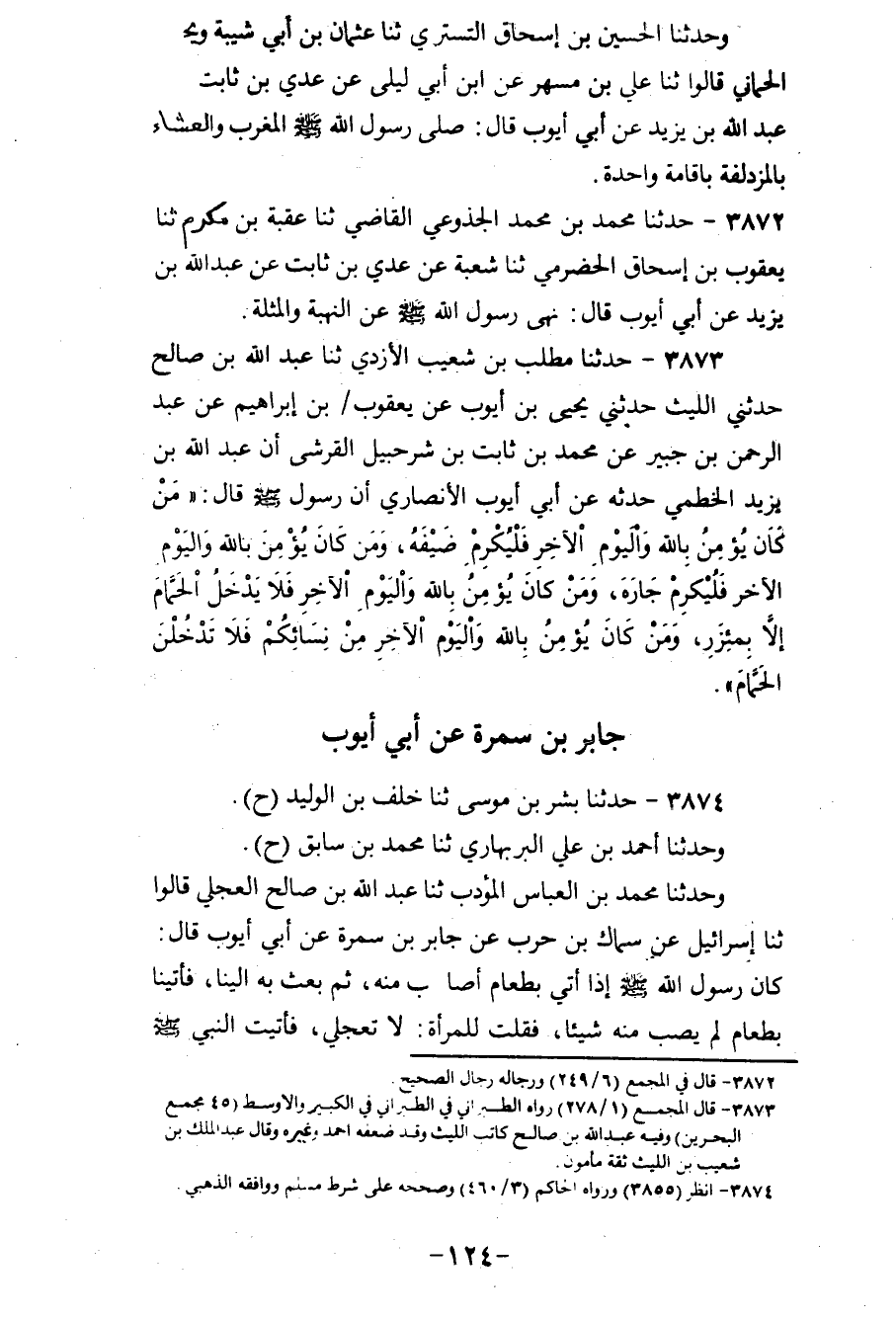 3873 - حَدَّثَنَا مُطَّلِبُ بْنُ شُعَيْبٍ الْأَزْدِيُّ، ثنا عَبْدُ اللهِ بْنُ صَالِحٍ، حَدَّثَنِي اللَّيْثُ، حَدَّثَنِي يَحْيَى بْنُ أَيُّوبَ، عَنْ يَعْقُوبَ بْنِ إِبْرَاهِيمَ، عَنْ عَبْدِ الرَّحْمَنِ بْنِ جُبَيْرٍ، عَنْ مُحَمَّدِ بْنِ ثَابِتِ بْنِ شُرَحْبِيلَ الْقُرَشِيِّ، أَنَّ عَبْدَ اللهِ بْنِ يَزِيدَ الْخَطْمِيَّ، حَدَّثَهُ، عَنْ أَبِي أَيُّوبَ الْأَنْصَارِيِّ، أَنَّ رَسُولَ اللهِ صَلَّى اللهُ عَلَيْهِ وَسَلَّمَ قَالَ: «§مَنْ كَانَ يُؤْمِنُ بِاللهِ وَالْيَوْمِ الْآخِرِ فَلْيُكْرِمْ ضَيْفَهُ، وَمَنْ كَانَ يُؤْمِنْ بِاللهِ وَالْيَوْمِ الْآخِرِ فَلْيُكْرِمْ جَارَهُ، وَمَنْ كَانَ يُؤْمِنُ بِاللهِ وَالْيَوْمِ الْآخِرِ فَلَا يَدْخُلِ الْحَمَّامَ إِلَّا بِمِئْزَرٍ، وَمَنْ كَانَ يُؤْمِنُ بِاللهِ وَالْيَوْمِ الْآخِرِ مِنْ نِسَائِكُمْ فَلَا تَدْخُلْنَ الْحَمَّامَ»